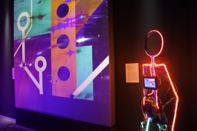 Заглавными работами выставки являются техно-арт-объекты Виталия Виноградова – художника «первой волны актуального искусства 90-х годов», живописца, медиаскульптора, создателя стиля «схематизм». Его инсталляция посвящена Человеку, его ощущению себя как части Бесконечного и Высшего, и стремлению познать неведомые космические дали. Центральная фигура инсталляции – «Кентавр» – биокиборг, призванный полететь в Космос на поиски «нового дивного мира».