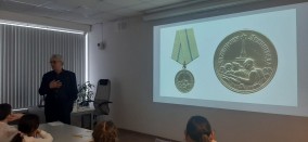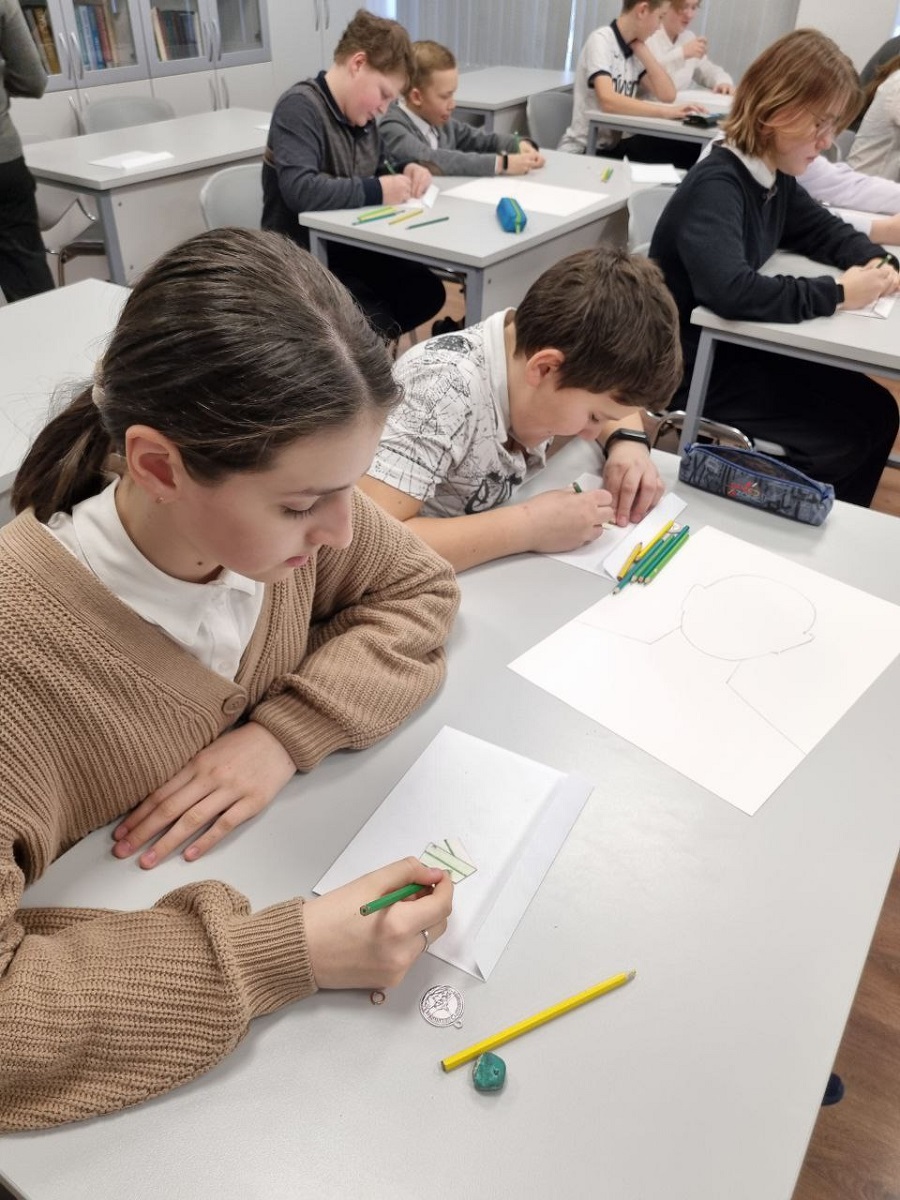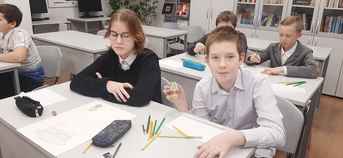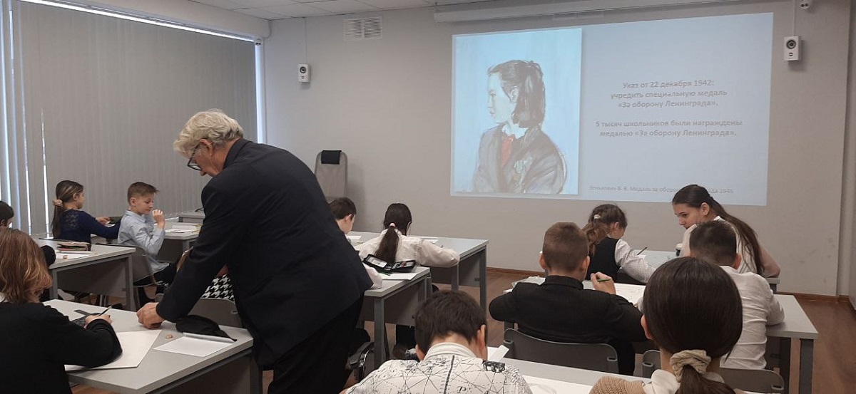 Ученики узнали о том, что Медаль «За оборону Ленинграда» – государственная награда, учреждённая в 1942 году. Вручалась всем героическим защитникам города, независимо социального статуса, возраста и рода деятельности. Были награждены 5000 детей! Кульминацией занятия стало изготовление модели медали «За оборону Ленинграда» своими руками. Вместе с Заслуженным учителем РФ Лыковым Николаем Николаевичем ребята нарисовали портрет жителя блокадного Ленинграда, изготовили медали и прикрепили их к портретам.