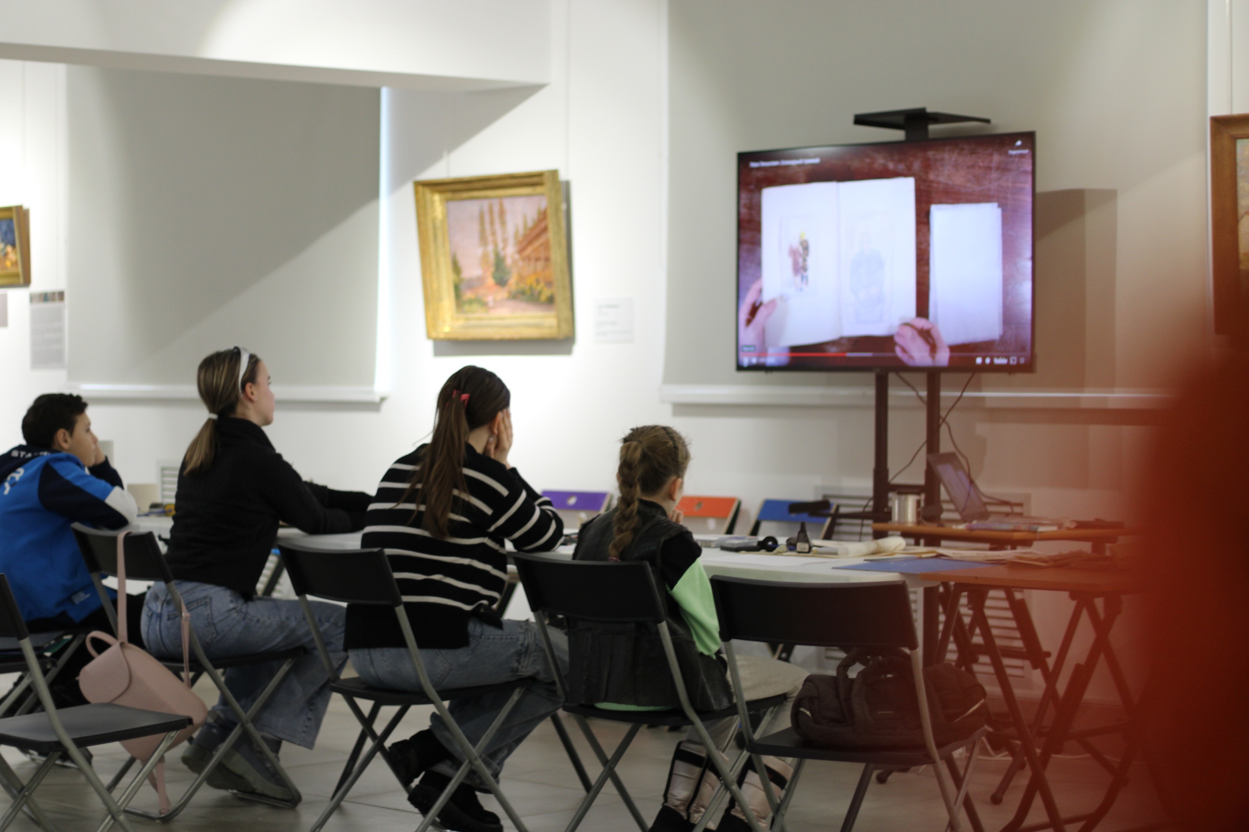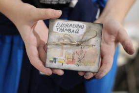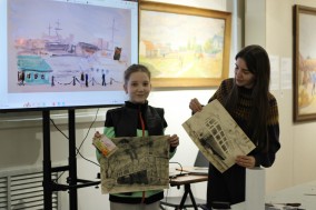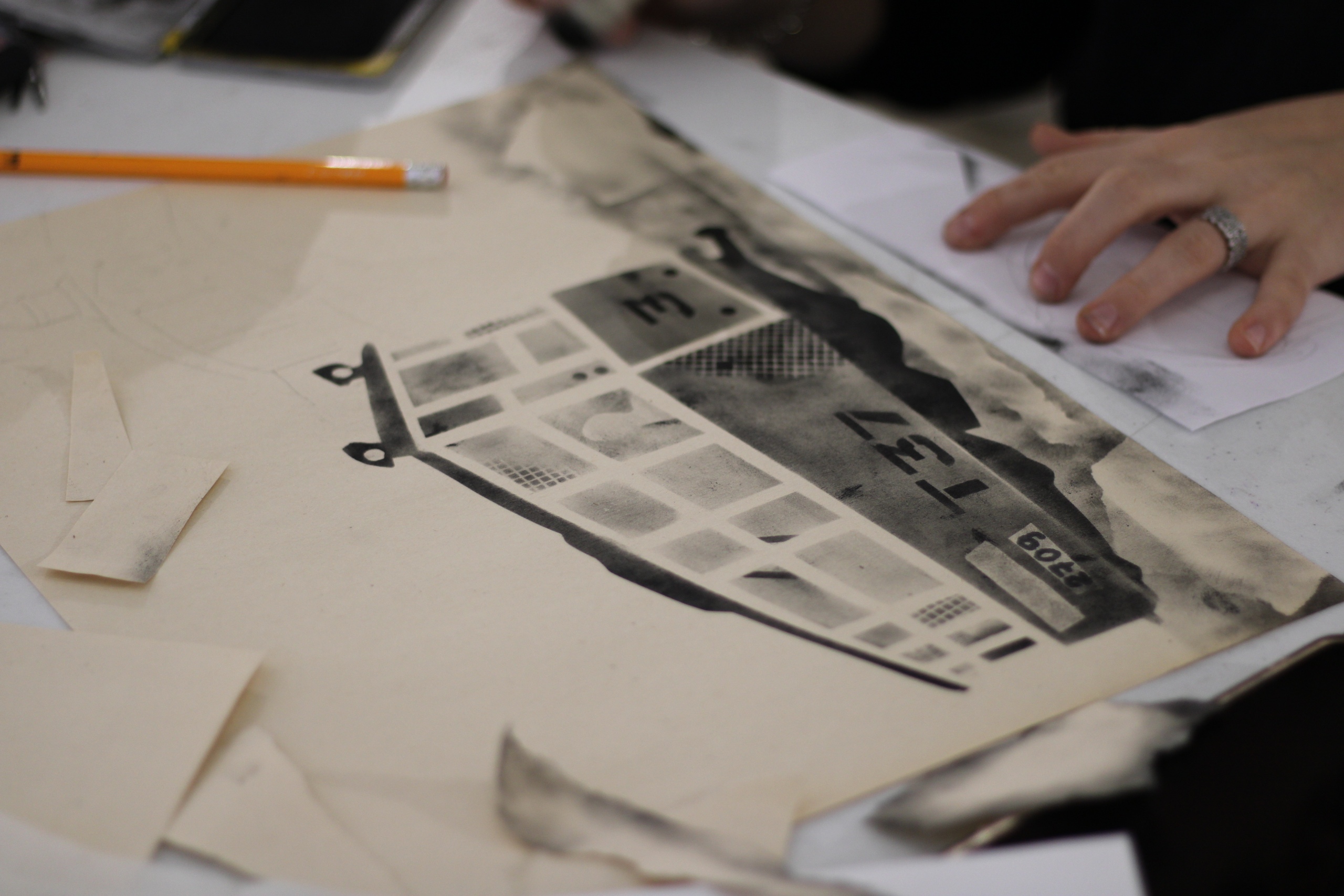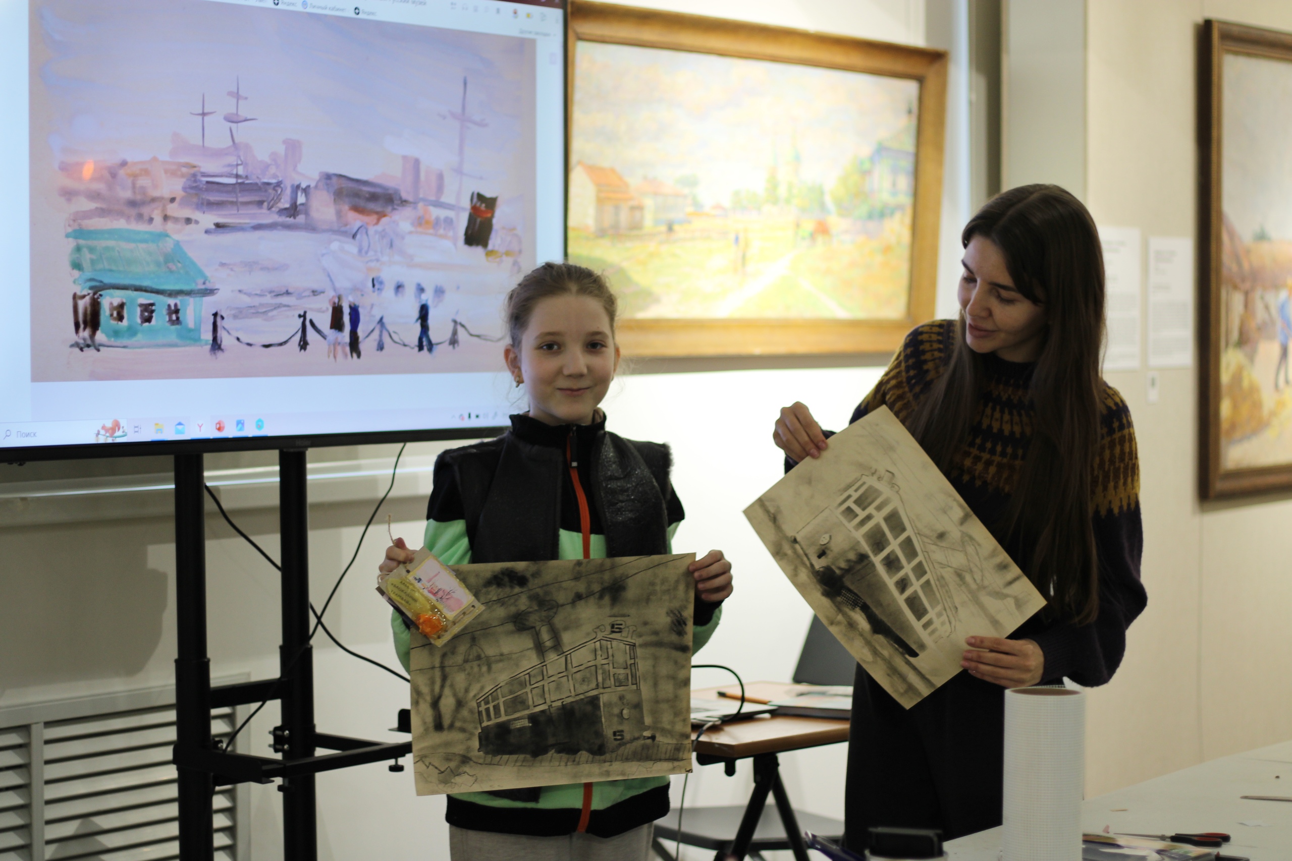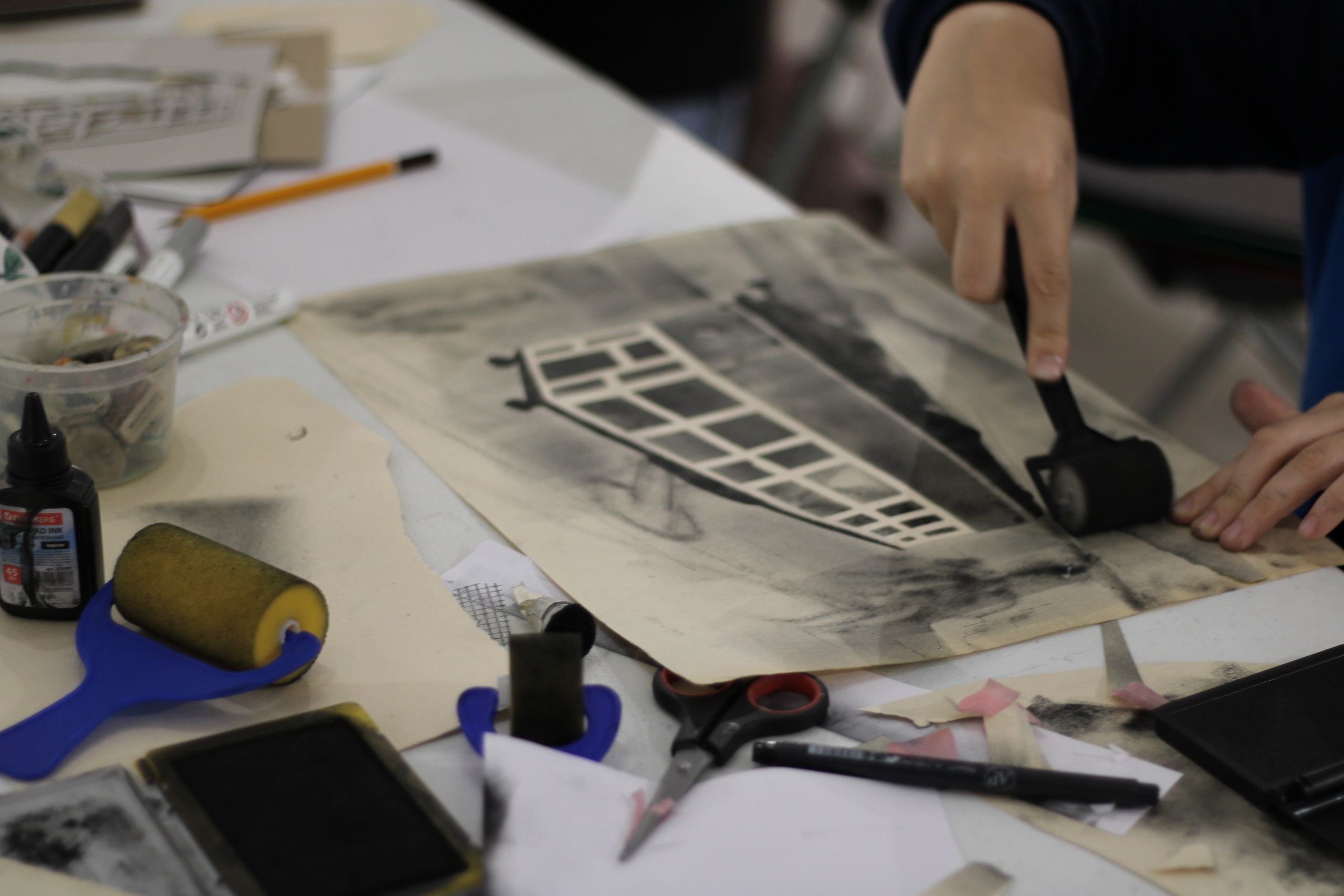 На мастер-классе ребята изучили технику ручной печати – трафарета с дорисовкой и работали над образом трамвая, в котором художница внимательно наблюдала за соседями. Для техники трафарета мы использовали готовый силуэт трамвая, который ребята дополняли деталями, а небо и снег штампировали с помощью кусочков рваной бумаги. Используя штемпельную подушку и валики ребята учились работать с тоном и добиваться плавных переходов, а для декоративных эффектов они использовали сетку-серпянку. Также ребята сделали небольшой альбом с репродукциями нескольких листов из альбома «Блокадный трамвай».