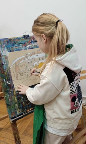Рассматривая детали, архитектурные элементы и человеческие фигуры на работах Бучкина Д.П. из цикла «Блокадный Ленинград» и подготовленном образце, участники мероприятия на тонированном листе бумаги создали свою художественную композицию: заснеженные улицы, дома и здания с входными арками и окнами, деревьями и кустарниками, старинными фонарями и печными трубами, людьми в зимней одежде с санками и авоськами.