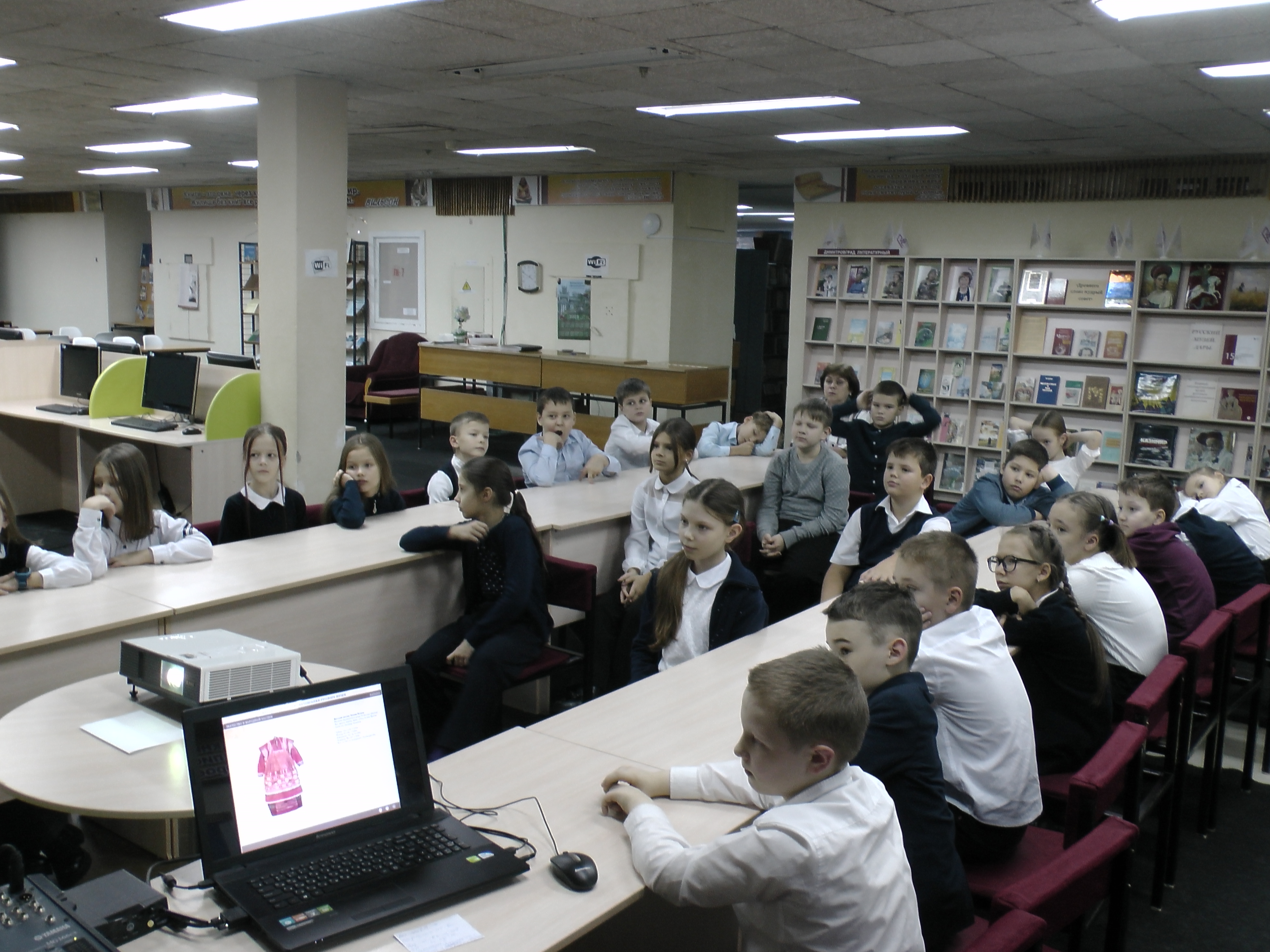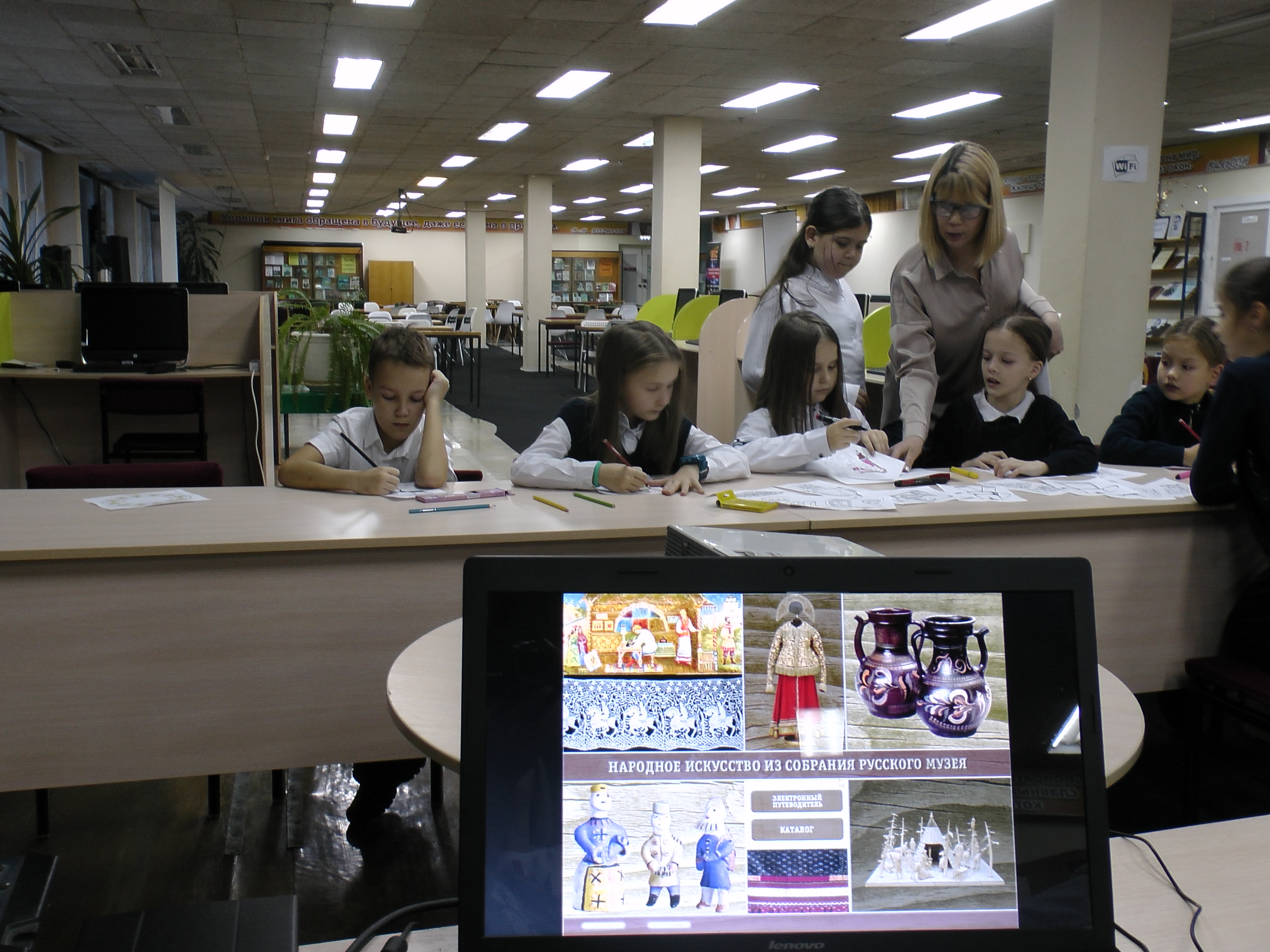 Сотрудники библиотеки «Дворец книги» решили продолжить тему народного творчества и показать на других примерах как можно преобразить предметы обихода. После просмотра интерактивной программы «Народное искусство из собрания Русского музея» детям дали задание: раскрасить предметы одежды и кухонной утвари.