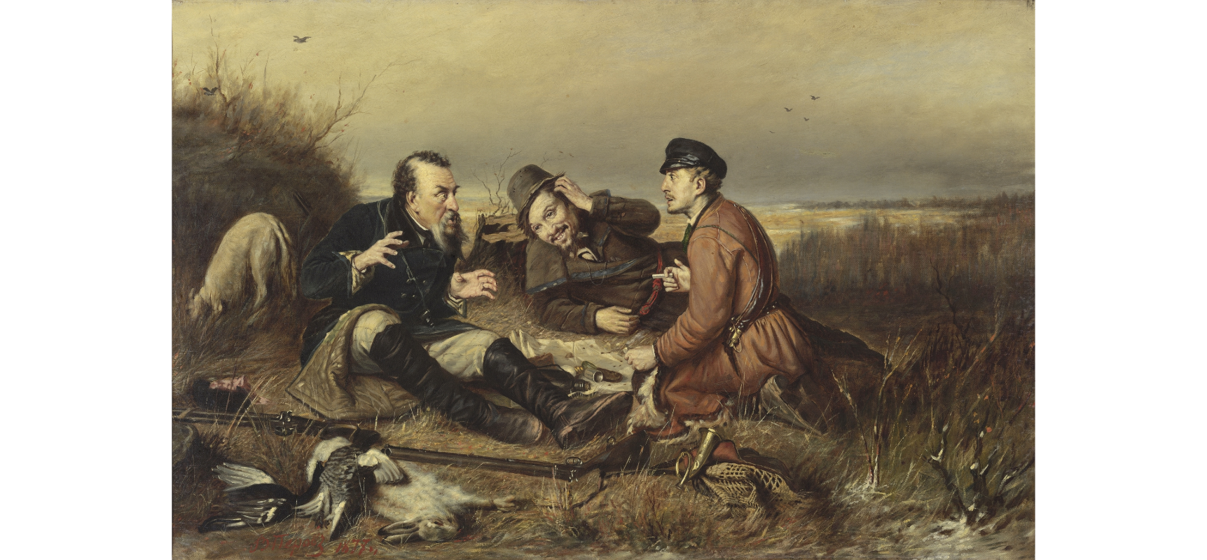 Картину "Охотники на привале", которая хранится в Государственном Русском музее, художник написал в 1877 (картина с одноименным названием 1871 года создания хранится в Государственной Третьяковской галерее).