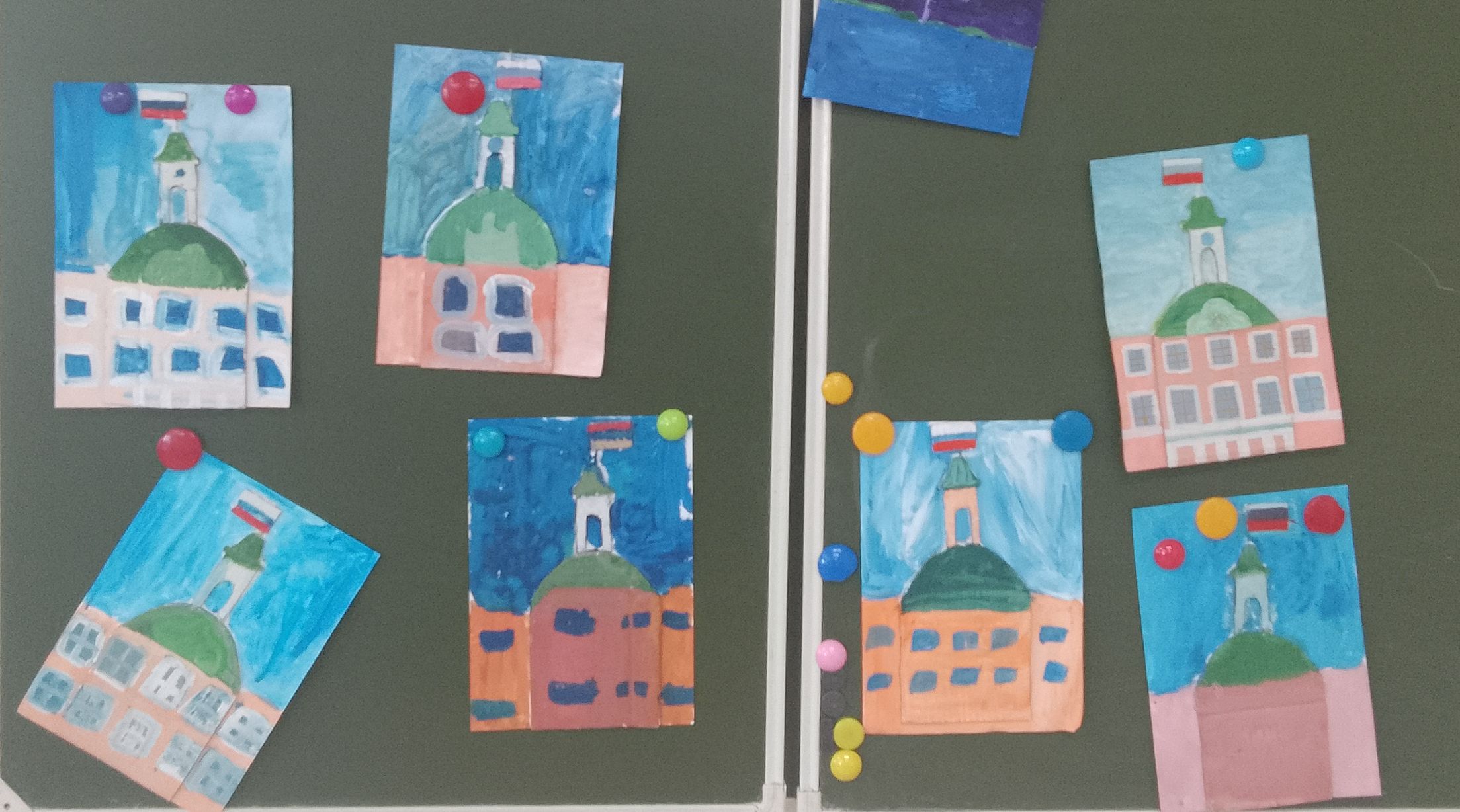 Ребята посмотрели фильм "Михайловский замок: реальный и виртуальный" из медиатеки Русского музея, а затем создали в смешанной технике восточный фасад Михайловского замка.