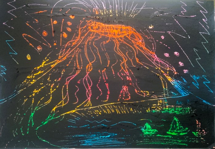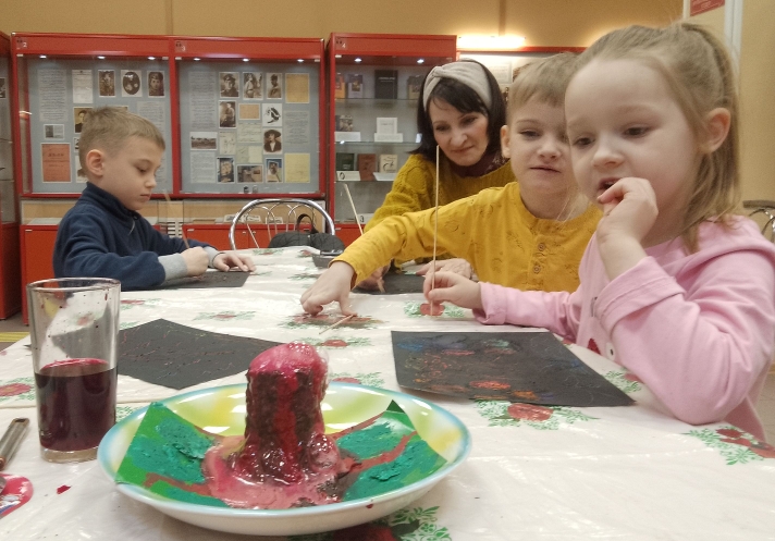 Ребята посмотрели фрагмент фильма «Великая картина Великого Карла» из цикла «Я и картина», а также увидели небольшой научный эксперимент «Извержение вулкана». Завершилось мероприятие мастер-классом«Стихия огня» в технике граттаж.