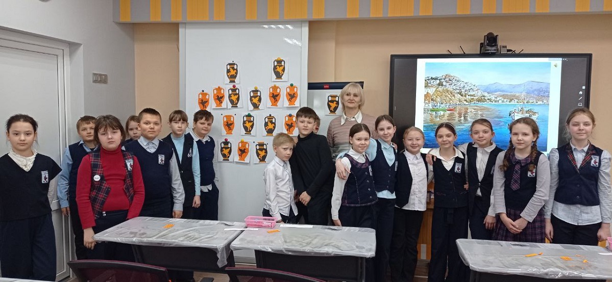 Учащиеся узнали о материале, разнообразии форм и назначении греческих ваз. Рассмотрев фотографии музейных экспонатов, ребята смогли самостоятельно определить стили росписи: краснофигурный и чернофигурный, поговорили о сюжетах росписи, как энциклопедии греческих мифов и о символическом значении орнаментов в росписи.