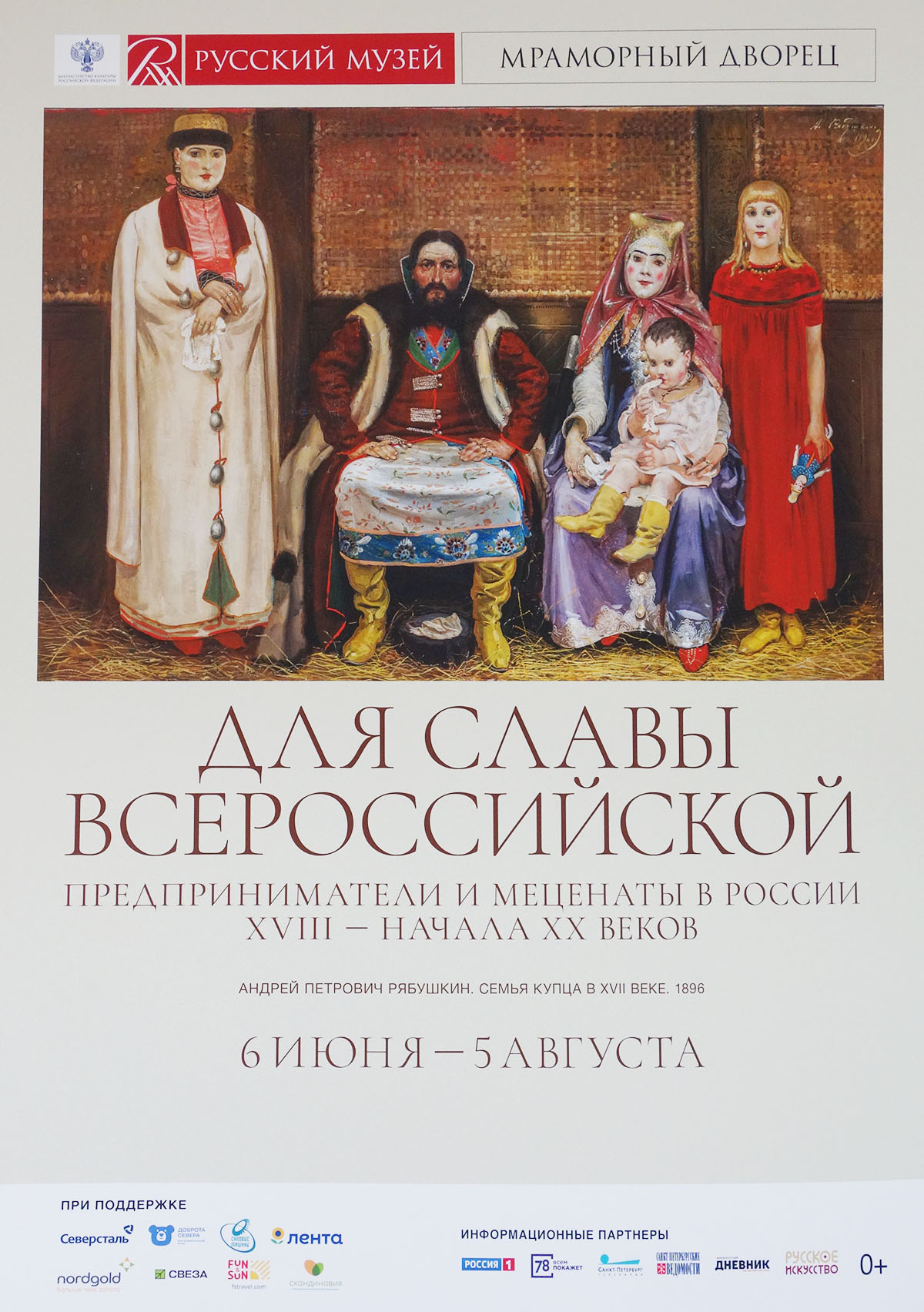Выставка «Для Славы Всероссийской. Предприниматели и меценаты в России XVIII — начала XX веков» уникальна по своей тематике и по составу произведений. На выставке будет показано более 200 произведений живописи, графики, декоративно-прикладного искусства и нумизматики из коллекции Русского музея. Купеческий портрет на этой выставке представлен во всем своем многообразии. Купечество, «третье сословие», в этот период было основой экономического могущества России. Строгановы, Демидовы и другие предприниматели порой организовывали целые «империи» со своими поселениями, дорогами, внутренним распорядком. Богатейшие купцы переходили в дворянское сословие, становились меценатами. Портреты XVIII века передают их внешний вид: вначале бородатые, в традиционной одежде, хотя и высокого качества, купцы переодеваются в европейское роскошное платье, предстают бритыми, в париках. Портреты XIX века имеют уже некий канонический тип: бородатые представительные мужчины позируют, демонстрируя медали, полученные за большие пожертвования, наградные перстни, письма и конверты, нередко с иностранными адресами, золотые монеты.