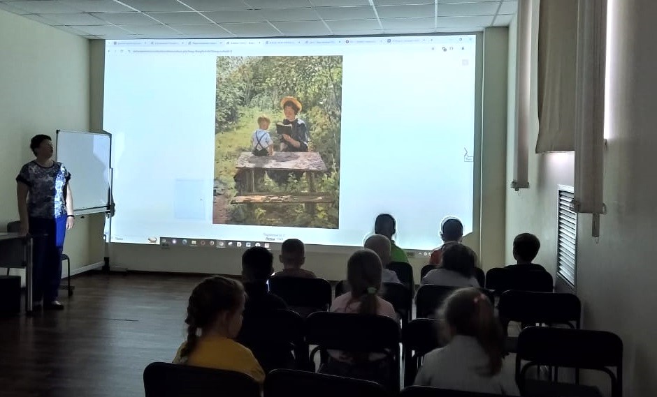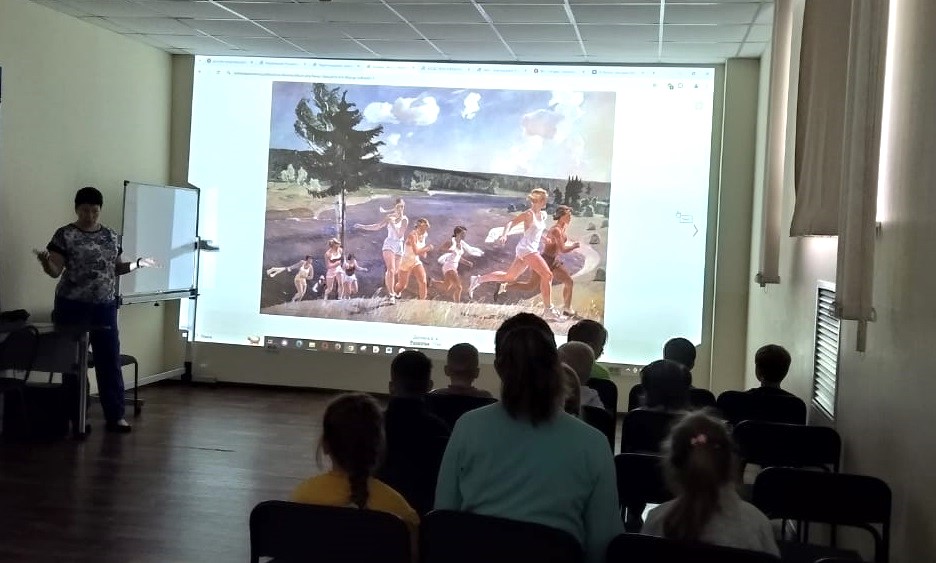 Дети с увлечением рассматривали картины из коллекции Русского музея и словно сами прогуливались по солнечным лугам, купались в прохладных реках, дышали свежим воздухом лесного простора и любовались красотой летнего неба. Вот девушки-спортсменки бегут по косогору послу купания в широкой реке, вот старшая сестра читает братику книгу в кружевной тени садовых деревьев, а вот бабушка с внучкой отдыхают после того, как насобирали полные корзины грибов.