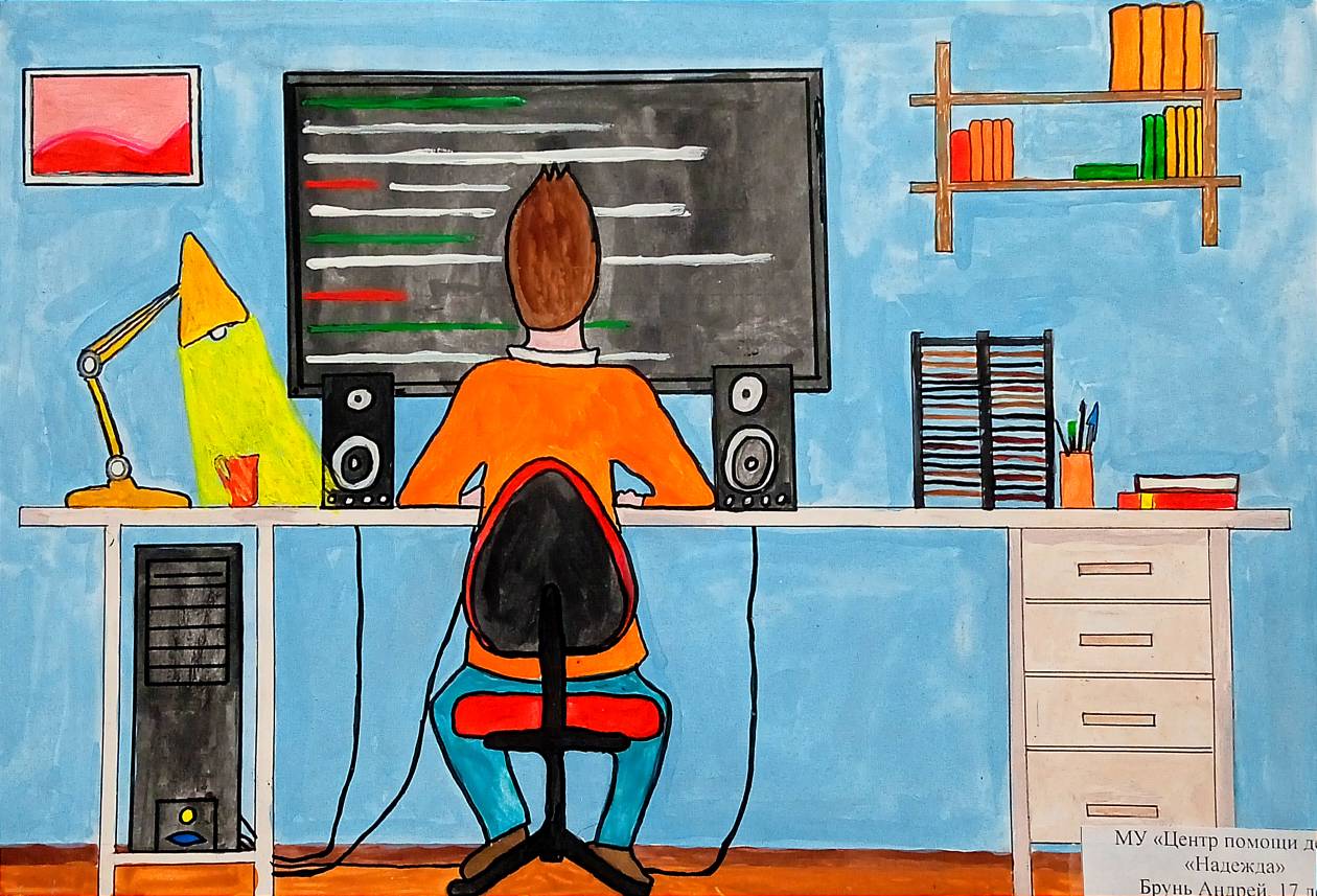 Третье место у Брунь Андрея, 17 лет, из центра «Надежда» (воспитатель Шаранова М.Ю.). Цветной рисунок «Я – программист» обладает уравновешенной композицией, четкостью в передаче конкретики будущей профессии.