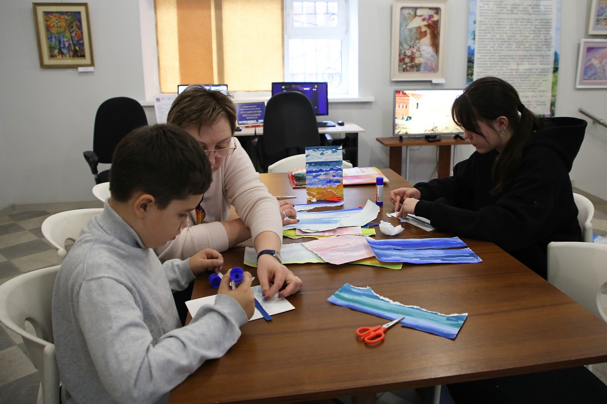 Во второй части тематического занятия участники мероприятия создавали аппликацию на тему стихии воды и делали её в технике «рваная бумага». Изображали пейзаж Финского залива.