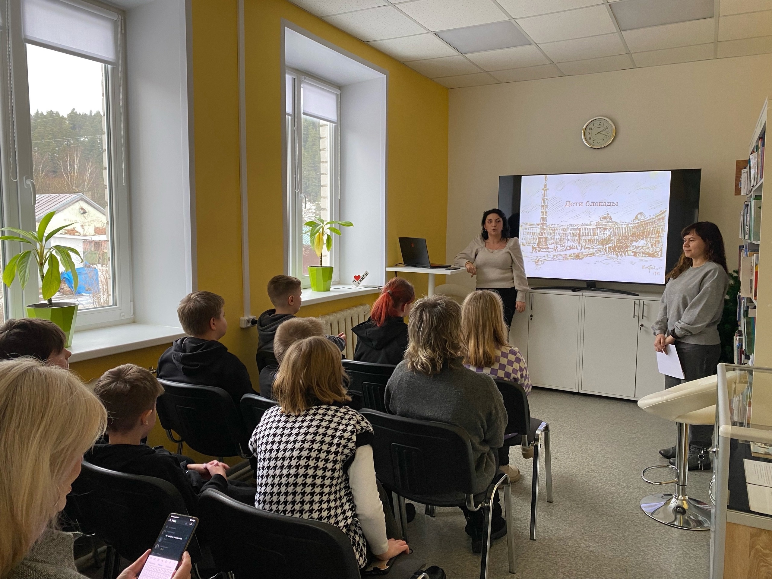 27 января в Хелюльской модельной библиотеке Приладожский центр Николая Рериха совместно с Виртуальным филиалом Русского музея провели интерактивную мастерскую «Дети Блокады» для учащихся 5 А класса СОШ №7.