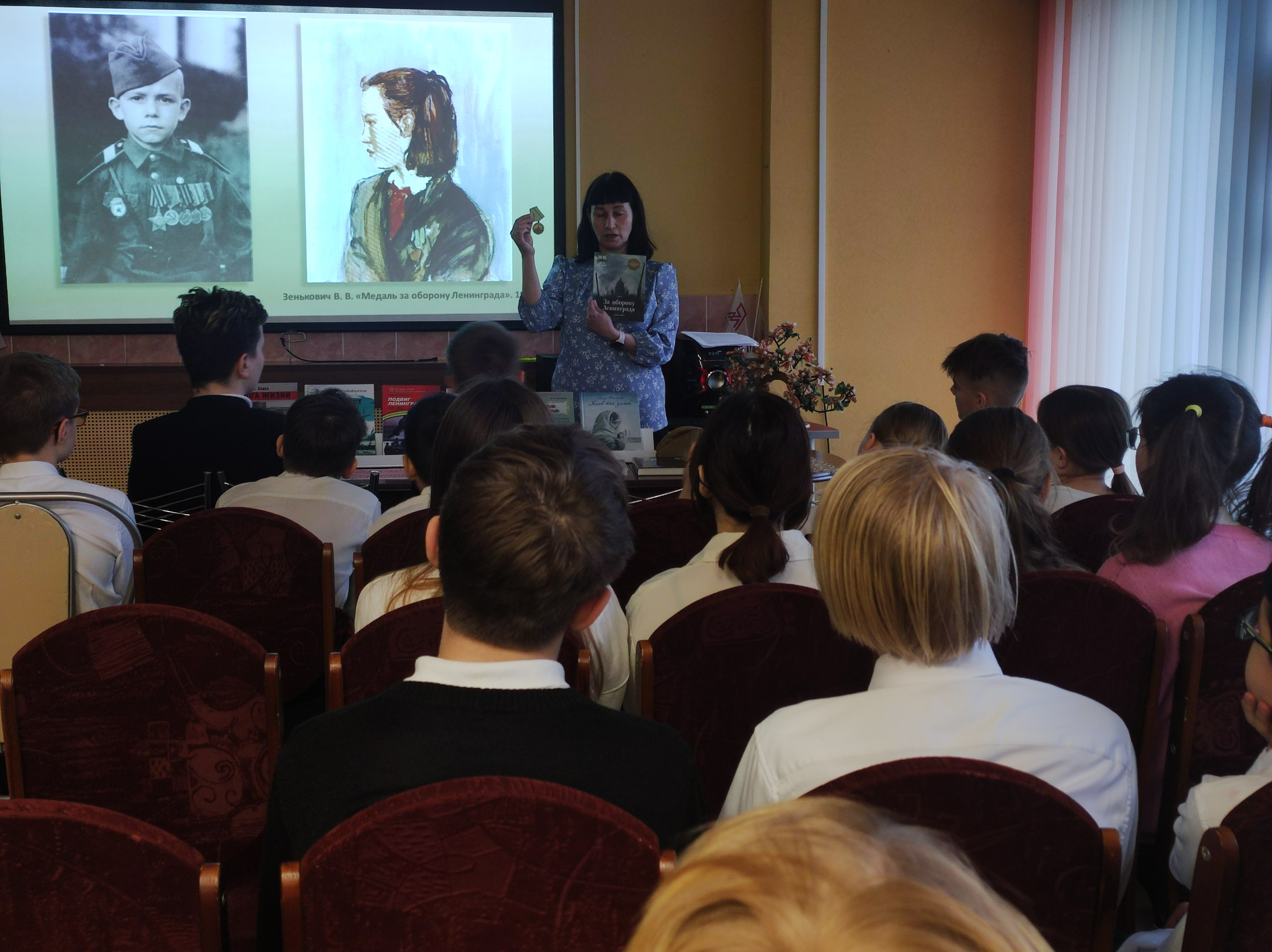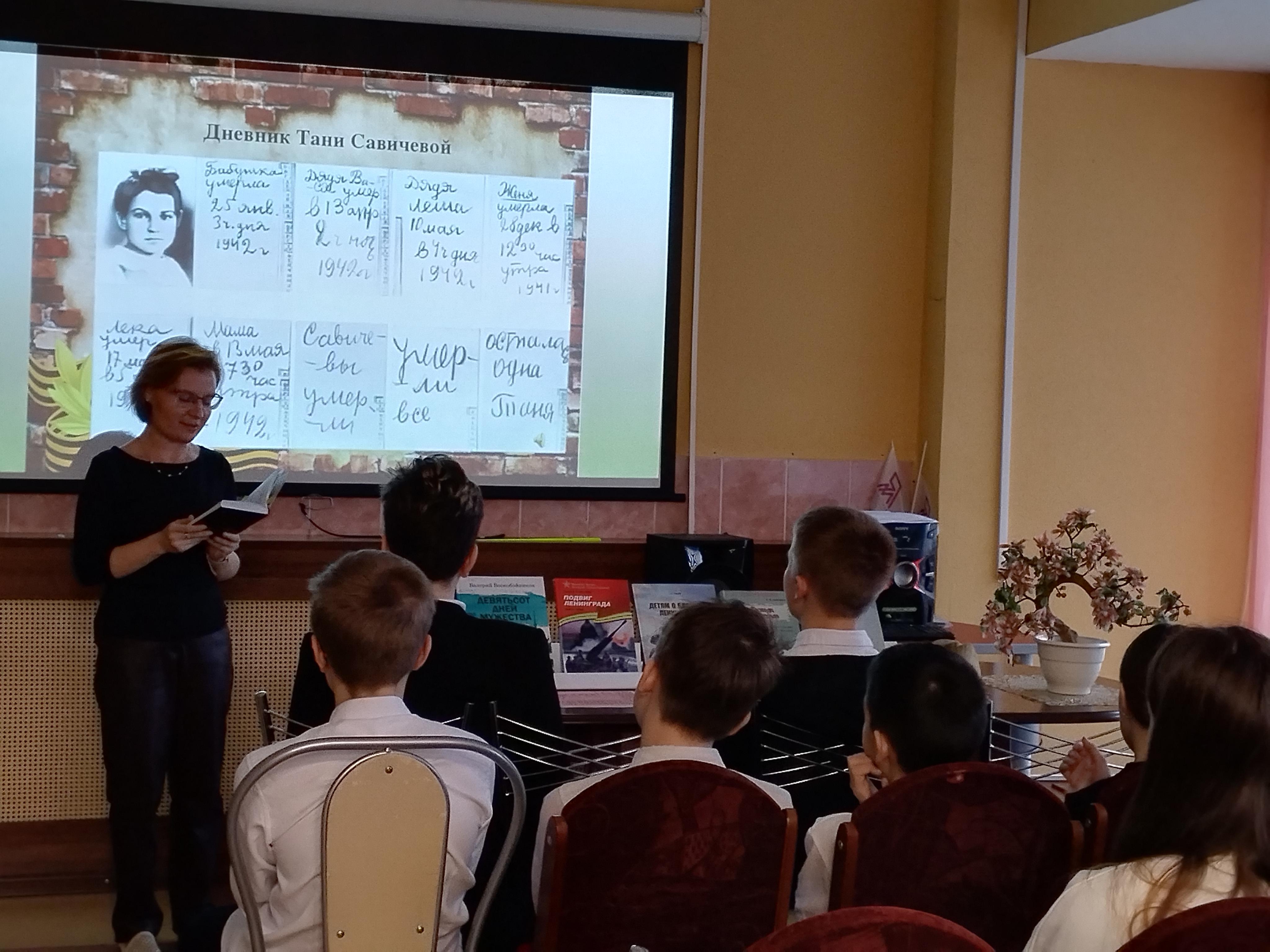 Состоялось занятие, посвящённое 95-летию со дня рождения Тани Савичевой. Урок начался с исторической справки, подготовленной библиотекарями по книге Григория Элькина «Детям о блокаде Ленинграда».