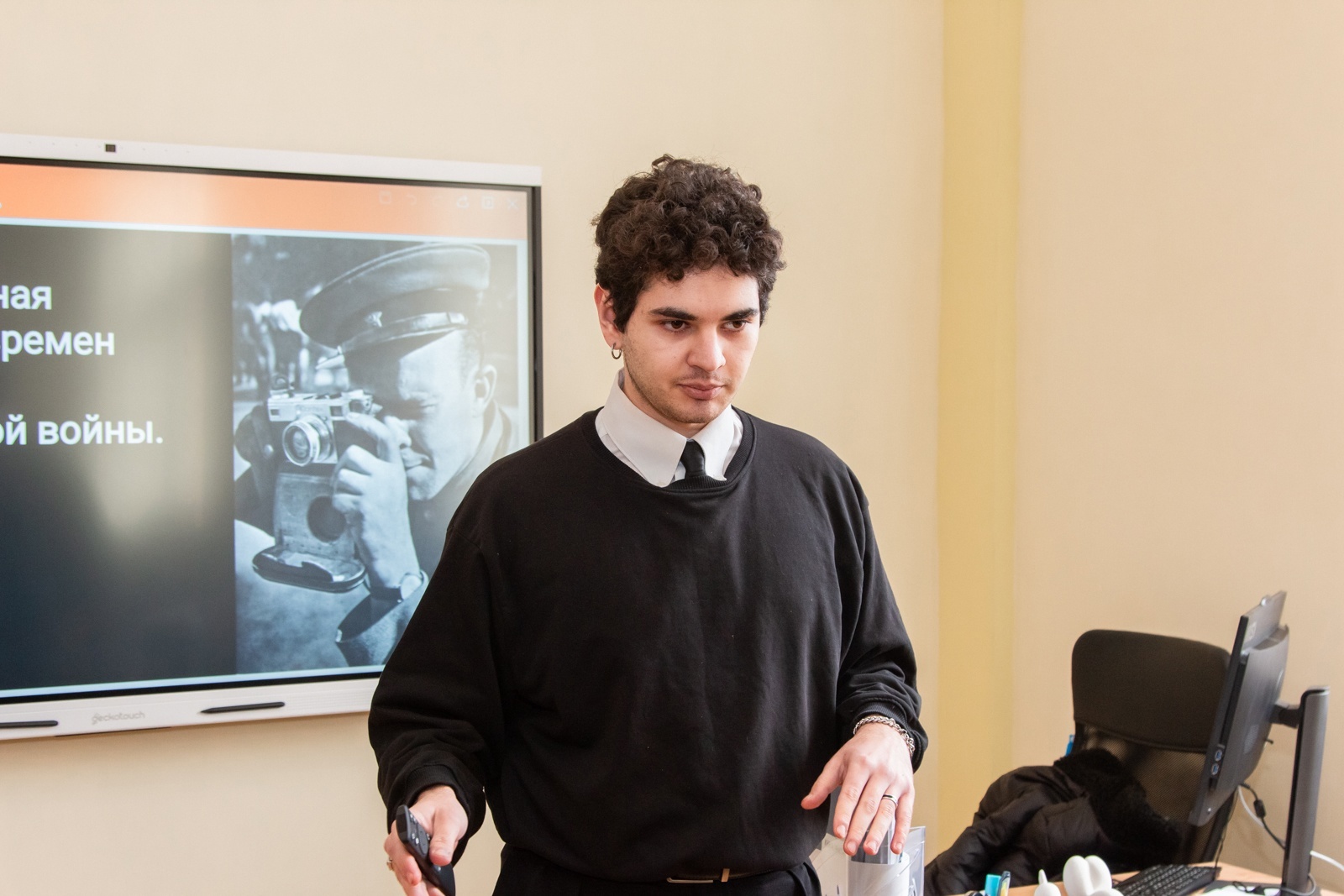 Он рассказал о героической работе фотожурналистов на фронтах Великой Отечественной войны. На примере фотографий наглядно показал ход войны, жертвенность и героизм нашего народа.Кирилл подчеркнул, что в условиях войны такие мастера как Макс Альперт и Евгений Халдей стали настоящими летописцами. Их работы, в числе которых и легендарный снимок «Знамя победы над Рейхстагом», вошли в золотой фонд военной фотожурналистики.В те сложные времена фотографы использовали как трофейные камеры Contax II, так и отечественные фотоаппараты ФЭД, «Лейка» и «Фактор №1». Именно они позволяли создавать качественные снимки даже в самых суровых условиях фронта.Лекция помогла студентам осознать важность фотожурналистики и искусства в формировании общественного сознания, создании образов и символов, вдохновляющих на свершения и укрепляющих веру в победу.