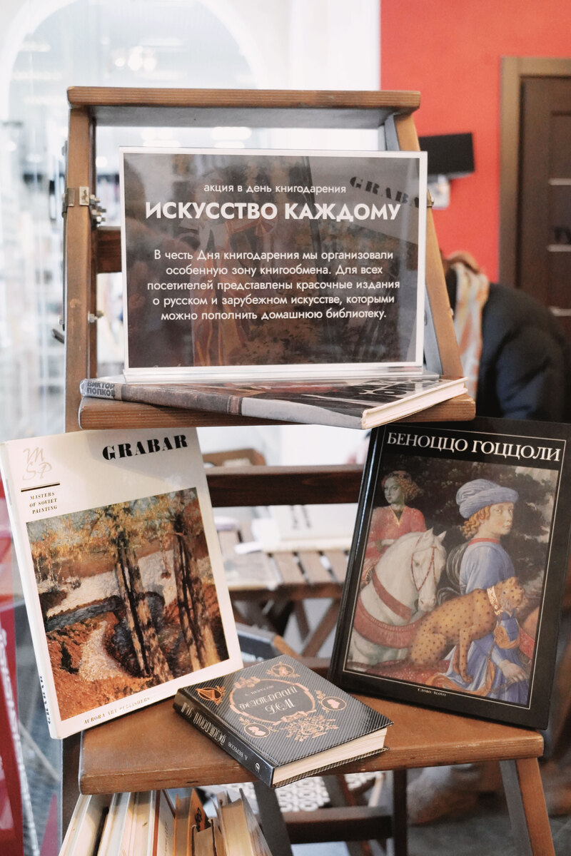 В этот день, с 12:00 до 20:00, у всех посетителей ЦРБ им. Н.В. Гоголя была возможность пополнить свою домашнюю библиотеку красочными изданиями о русском и зарубежном изобразительном исскустве. Из фондов книгообмена были выбраны альбомы с репродукциями известных картин и книги с биографиями выдающихся художников. Можно было выбрать любую книгу и забрать её, не оставляя другую взамен. Также в холле, где расположилась зона книгообмена, посетители библиотеки знакомились с несколькими фильмами из медиатеки Виртуального Русского музея, которые воспроизводились на медиа-стене.