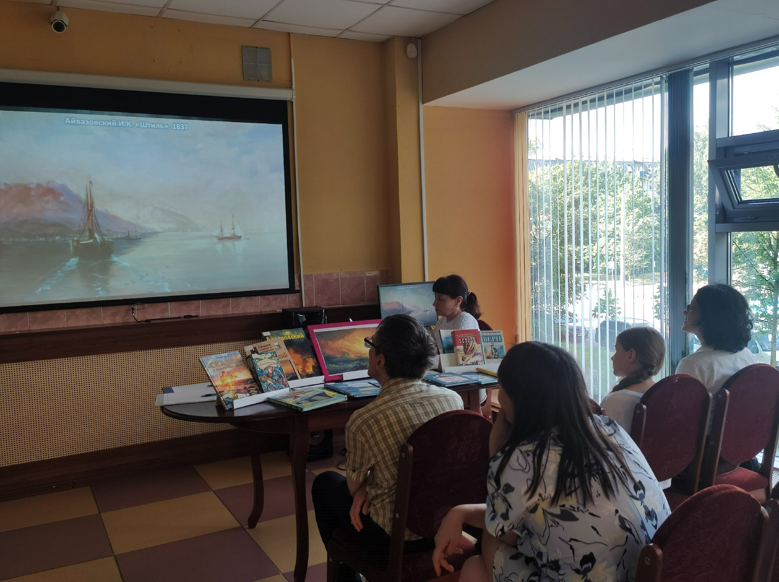 Посетителям была рассказана краткая биография художника, показаны наиболее известные полотна с изображением моря: «Этюд воздуха над морем», «Штиль», «Буря над Евпаторией», «Девятый вал», «Радуга», сделан блиц-обзор книжной выставки. Зрители отвечали на вопросы, рассуждали об изображенных на картинах событиях и людях, выражали свое отношение к сюжету картин.