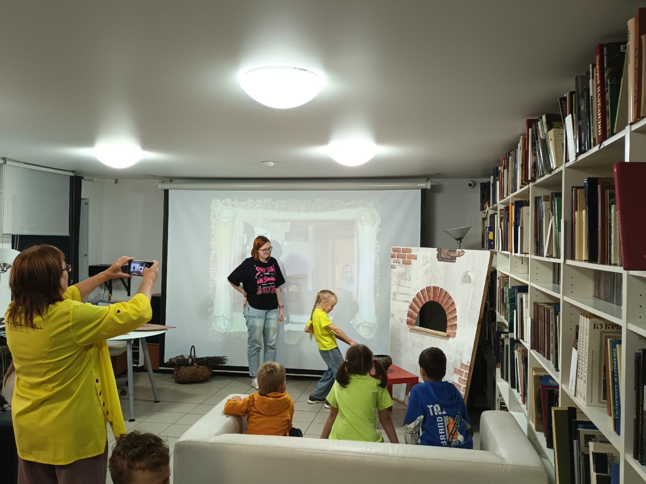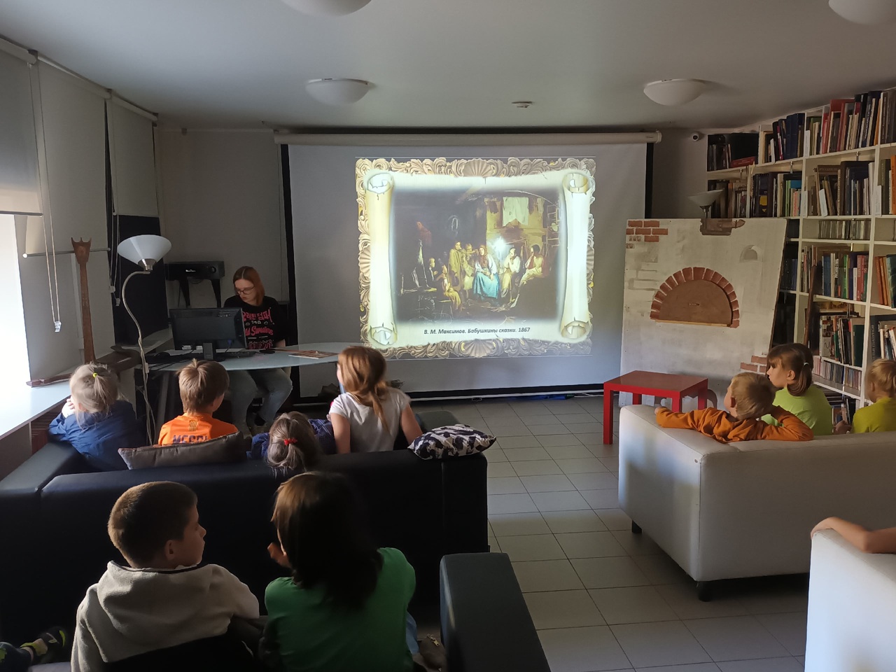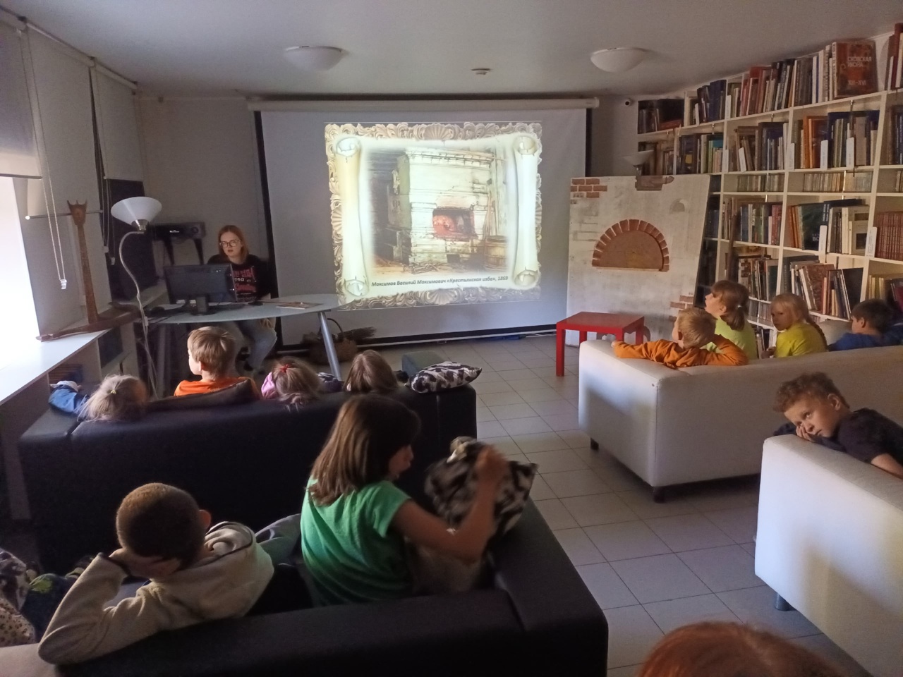 В виртуальном филиале Русского музея в Выборге ребята из социального центра отправились в далекое прошлое. Рассматривая картины  А. Саврасова, И.Репина, И. Левитана и других русских художников, дети узнали как выглядили жилища далеких предков, почему избы рубили, откуда возникло само слово "изба", что такое полати, бабий кут и красный угол. Вспомнили рецепты из русских народных сказок и предметы русского быта, воспользовались ухватом, коромыслом и кочергой, попытались спрясть нитку на старинной прялке. А также посмотрели фильм "Народное искусство".
