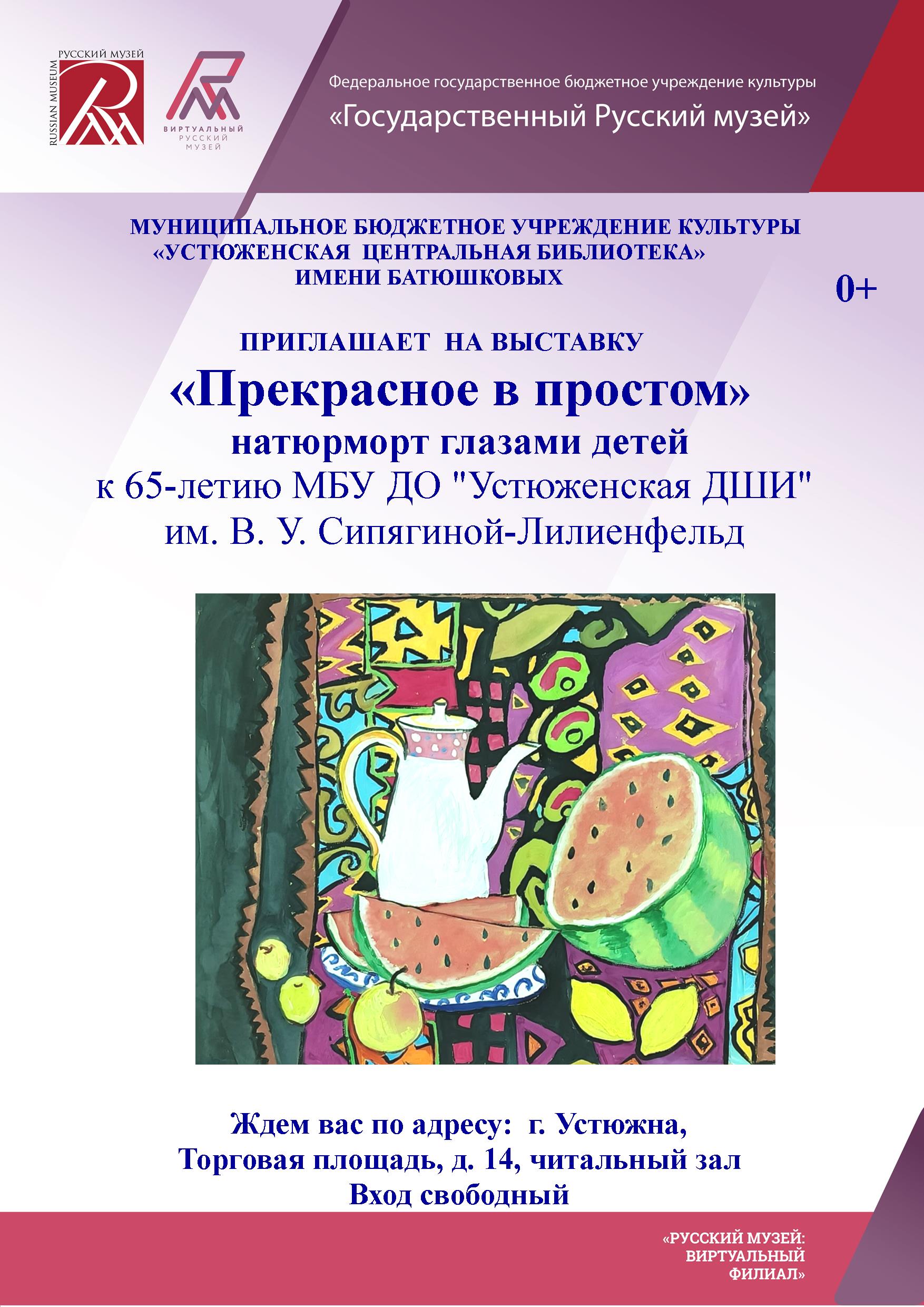 Приглашаем вас посетить экспозицию «Прекрасное в простом», которая развернулась в информационно-образовательном центре «Русский музей: виртуальный филиал» при библиотеке имени Батюшковых. Данное мероприятие приурочено к 65-летию Муниципального бюджетного учреждения дополнительного образования «Устюженская детская школа искусств».