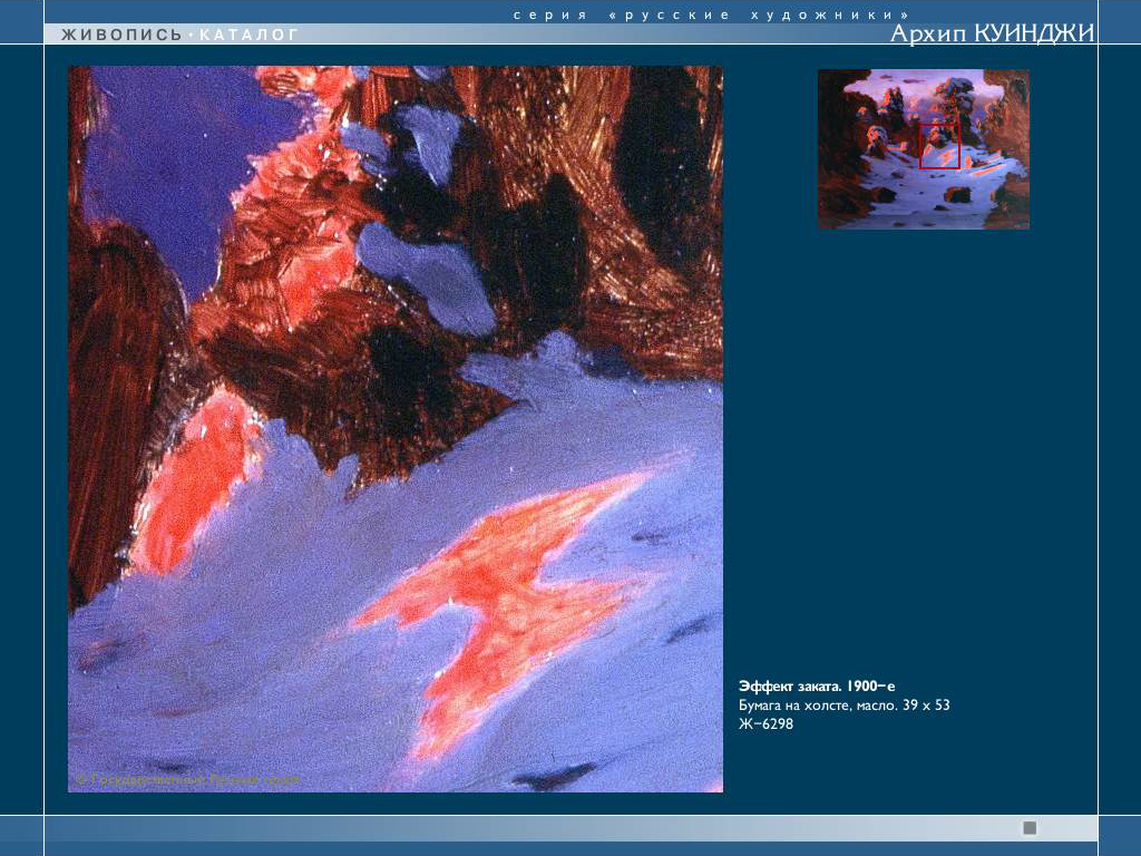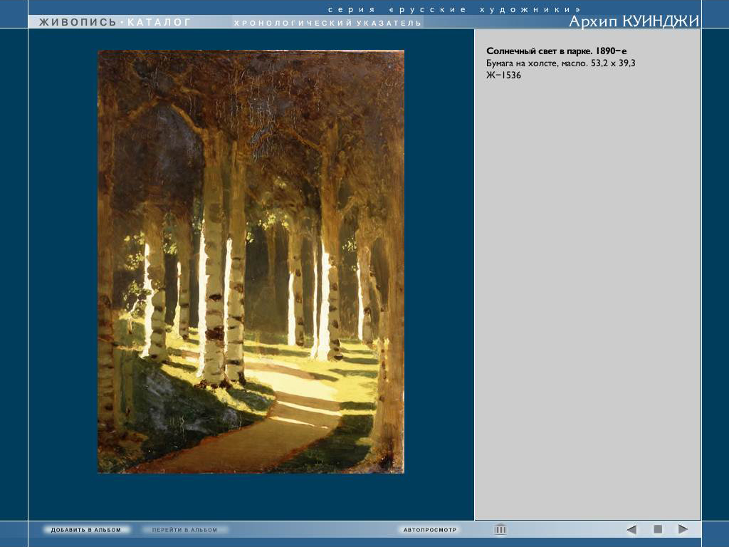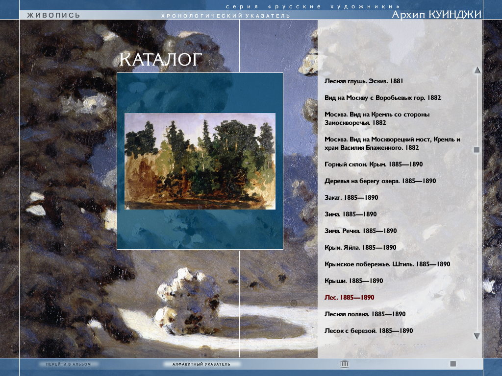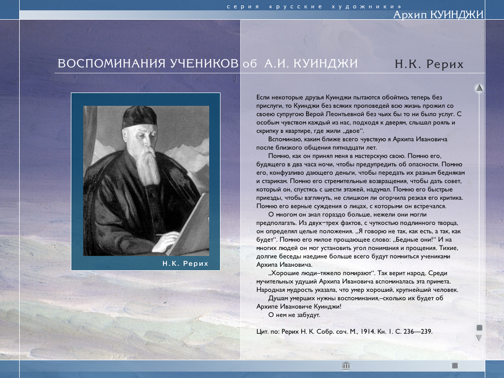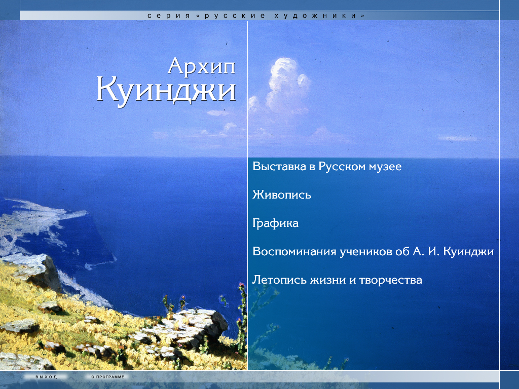 Программа посвящена творчеству Архипа Ивановича Куинджи, включает свыше 220 произведений из Русского музея (живопись и графика), а также статьи специалистов, материалы о жизни художника, фотографии художника из архива музея и портретные рисунки современников.