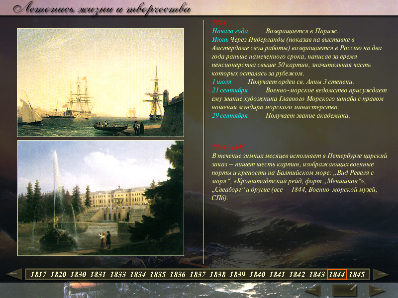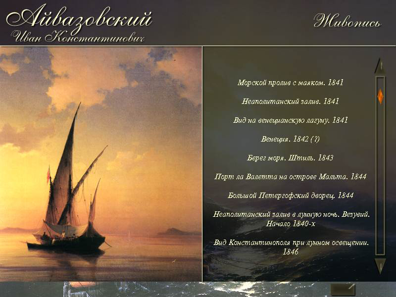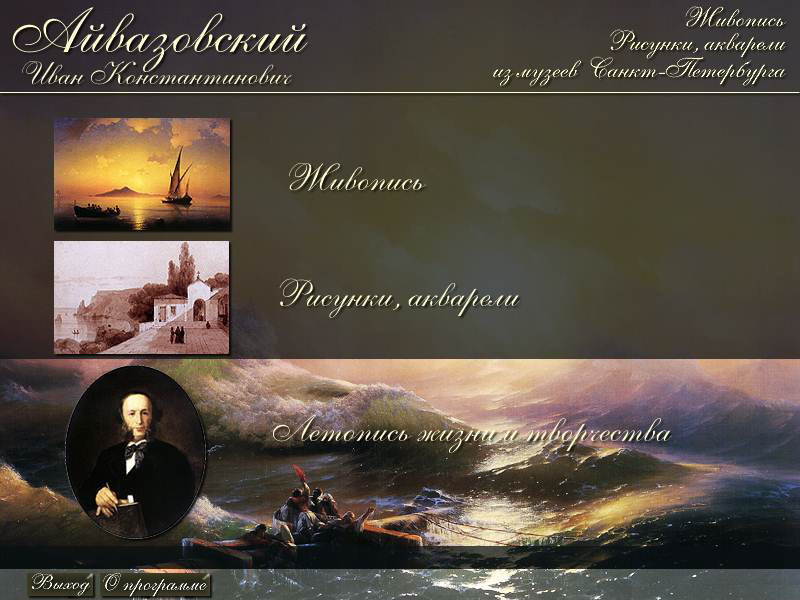 В программе представлено около 100 живописных и графических произведений художника-мариниста Ивана Константинович Айвазовского из коллекций Русского музея, Центрального военно-морского музея, музеев-заповедников «Петергоф» и «Царское Село», а также летопись жизни и творчества мастера.