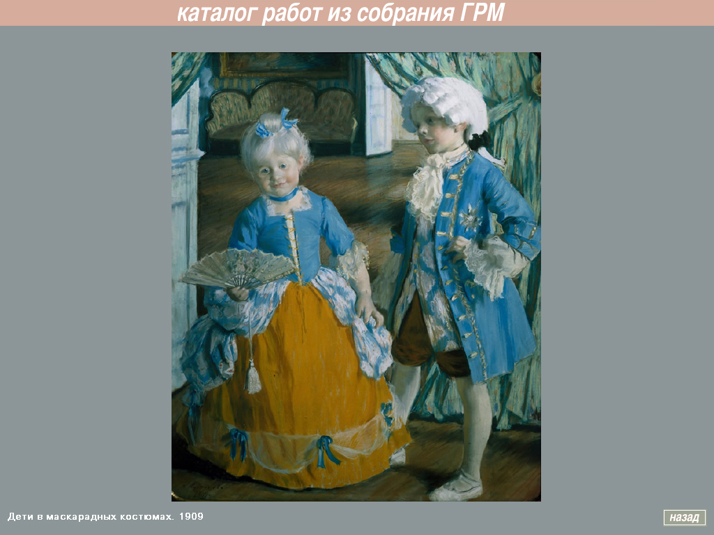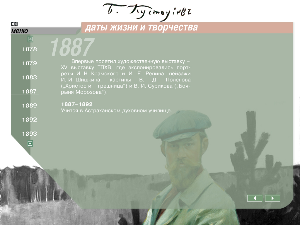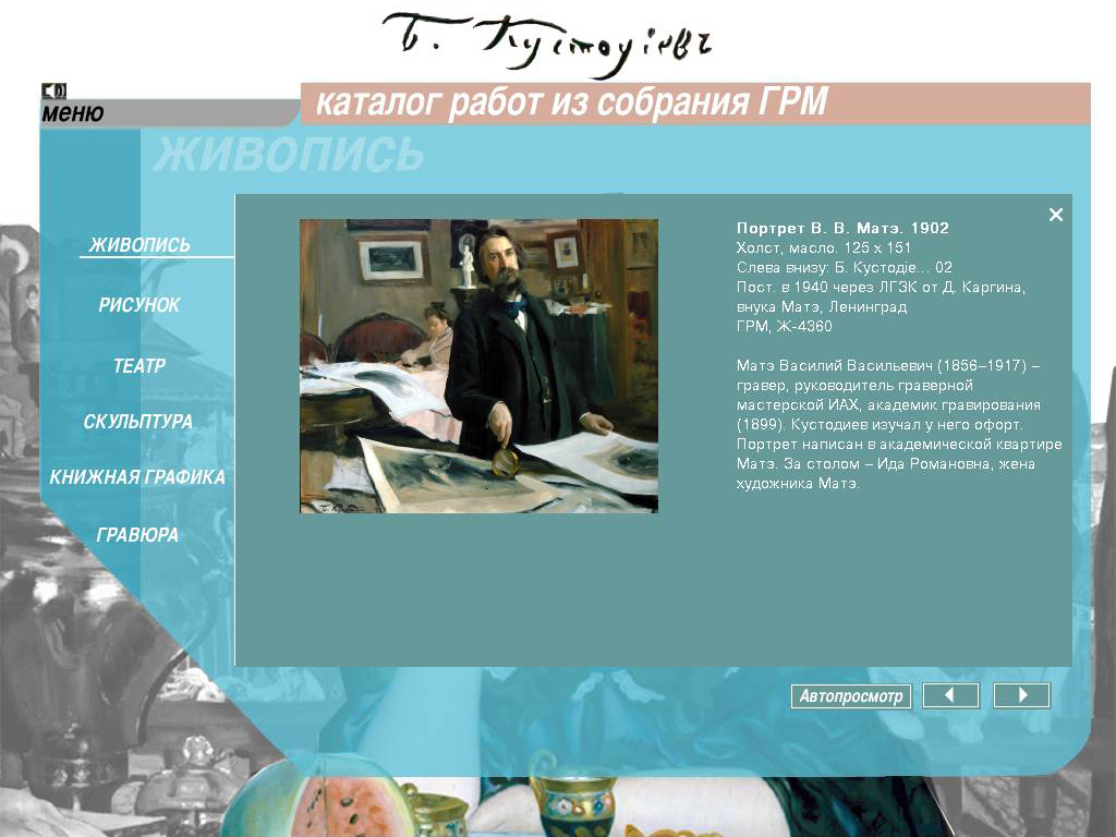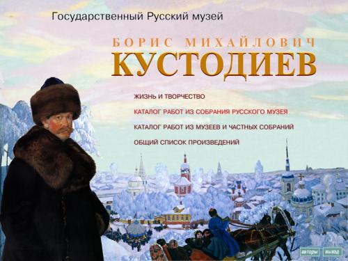 В программе представлено более 400 работ Б.М. Кустодиева из музеев, библиотек и частных собраний России. Можно ознакомиться с биографией художника, посмотреть его работы; имеются хронологический и алфавитный указатели.