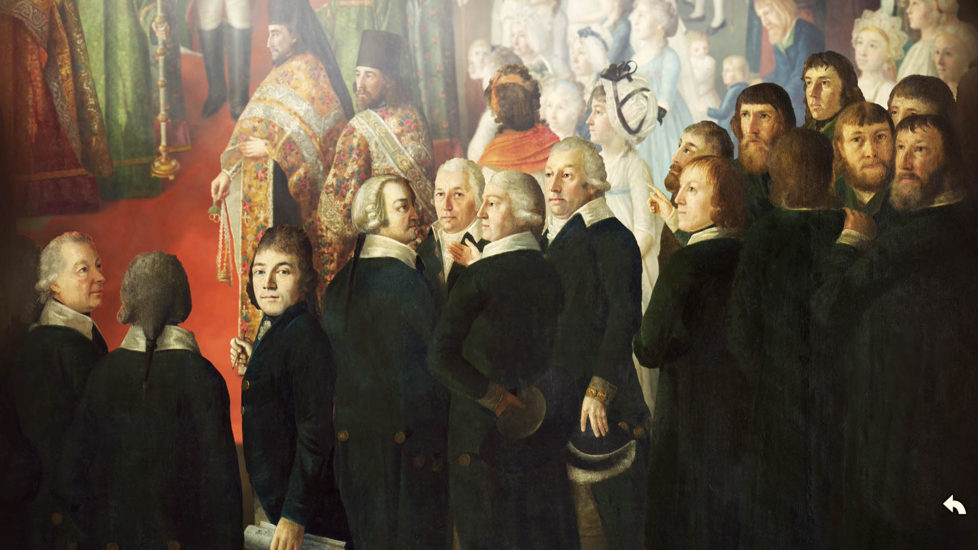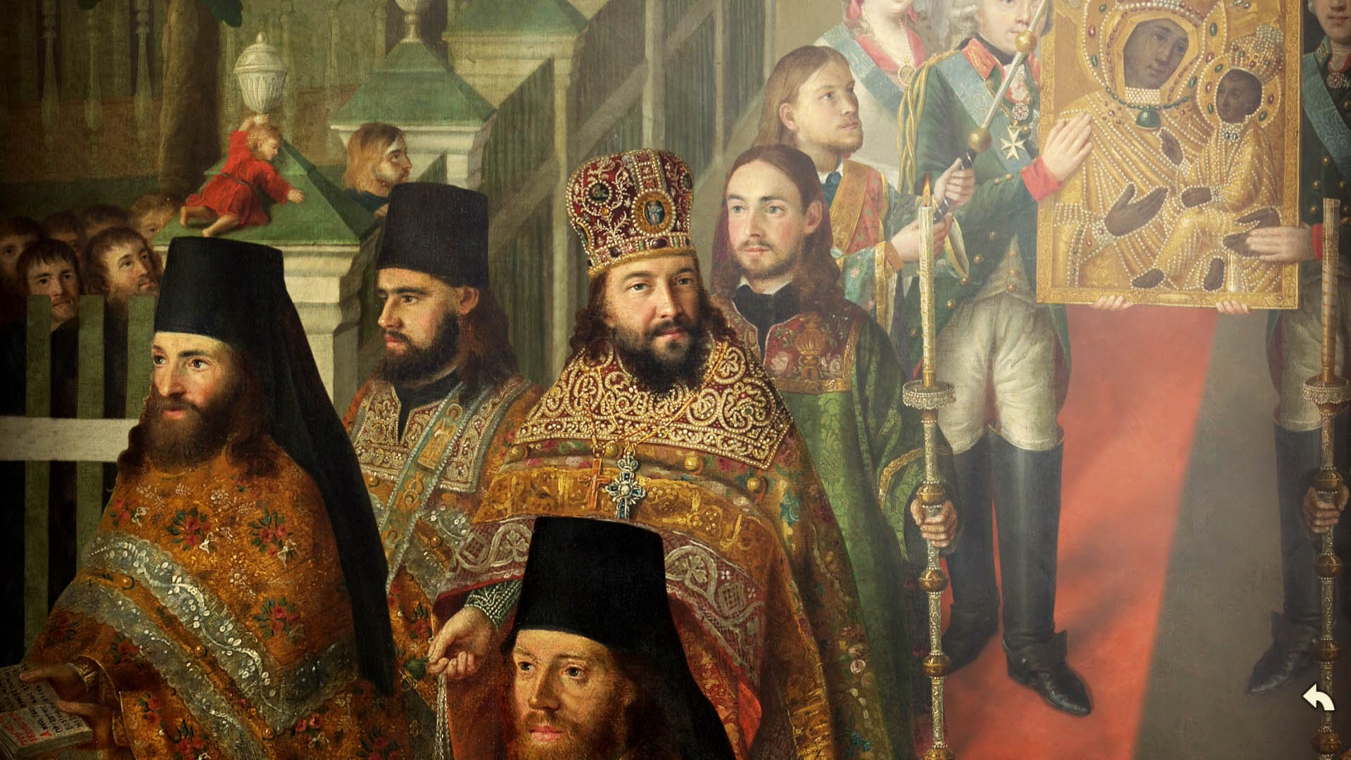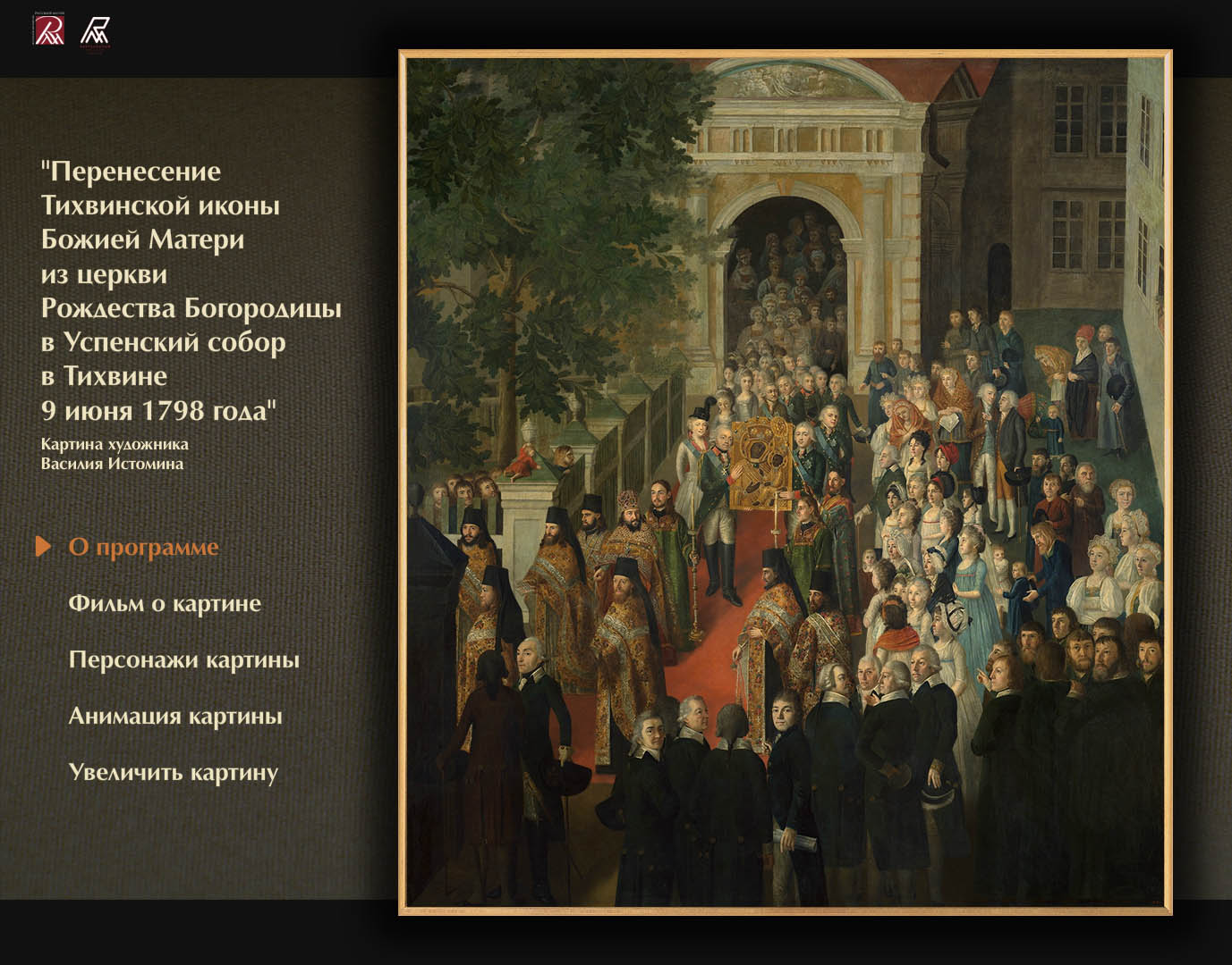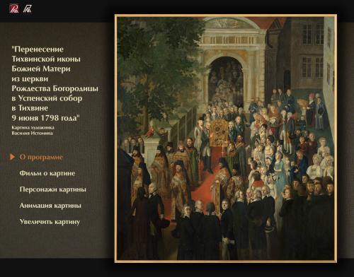 Интерактивная программа по картине Василия Истомина позволяет подробней познакомиться с участниками церемонии. Среди них помимо членов императорской семьи присутствовали канцлер граф А.А. Безбородко, предводитель уездного дворянства П.В. Римский-Корсаков (дедушка композитора Н.А. Римского-Корсакова), военный деятель А.А. Аракчеев, заказчик картины архимандрит Герасим и многие другие, также художник изобразил не менее 80-ти тихвинцев. Программа состоит из пяти разделов и позволяет рассмотреть изображение в высоком разрешении, а также увидеть авторскую анимацию.