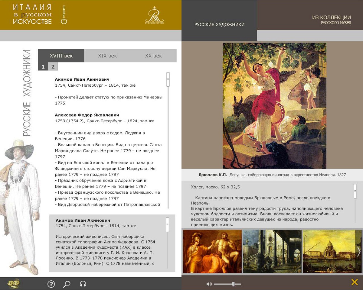 Мультимедийная программа объединяет около 500 произведений русских художников, работавших в Италии и итальянских мастеров, оставивших свой след в русском искусстве, в том числе внесших значительный вклад в архитектурный облик дворцов Русского музея.