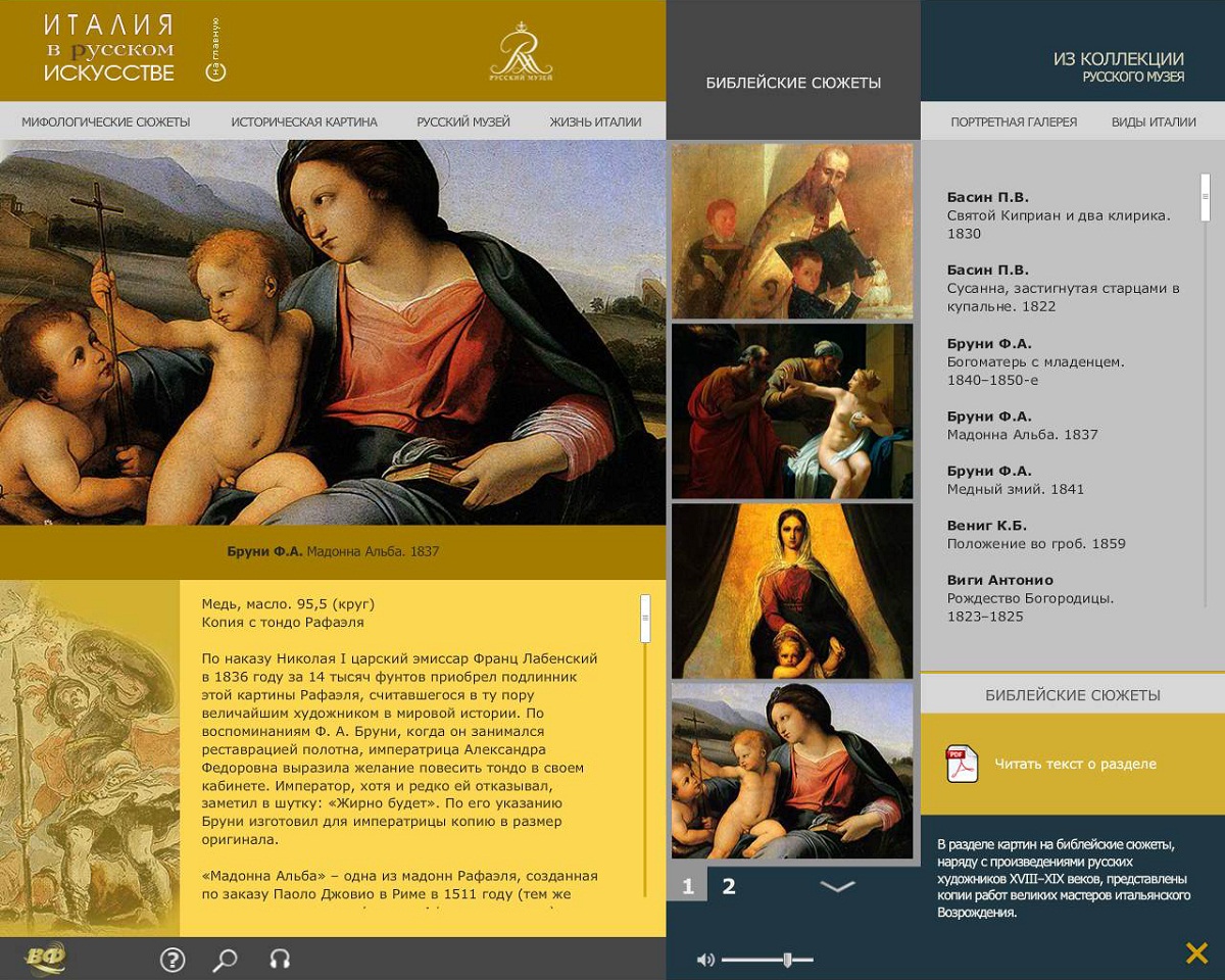 Основной раздел программы «Галерея» включает несколько подразделов: античная мифология, библейские сюжеты, историческая картина, портретная галерея, виды Италии, жизнь Италии, Русский музей. Все произведения сопровождаются аннотациями, а каждый раздел Галереи ‒ подробным пояснительным текстом и музыкальным сопровождением. Алфавитный каталог русских и итальянских авторов, разделенный на основные хронологические периоды с XVIII по XX век, дополнен биографиями художников. Кнопка «Картина крупным планом» позволяет рассмотреть детали избранных произведений, а «Аудиогид» ‒ прослушать дополнительную информацию. Программа создана на 3-х языках ‒ русском, английском и итальянском.