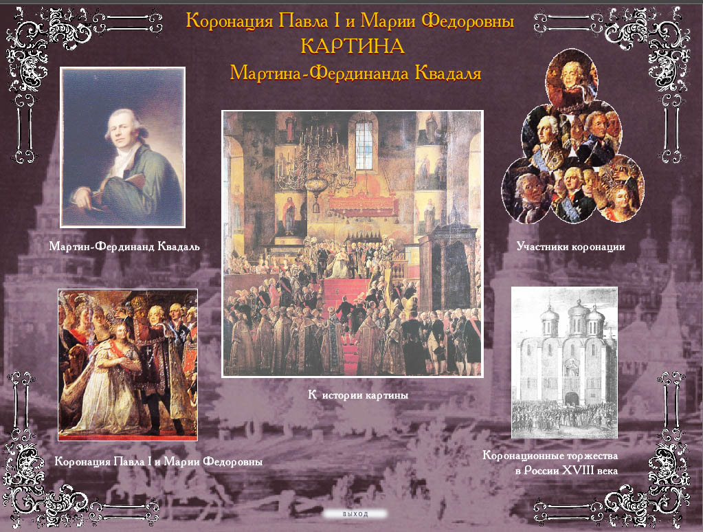 Программа посвящена коронации Павла I, которую запечатлел на своем полотне художник французского происхождения М.-Ф. Квадаль. Материалы программы позволяют получить представление о церемониале коронации, о ее участниках, а также об Успенском соборе Московского Кремля, в стенах которого проходила церемония.