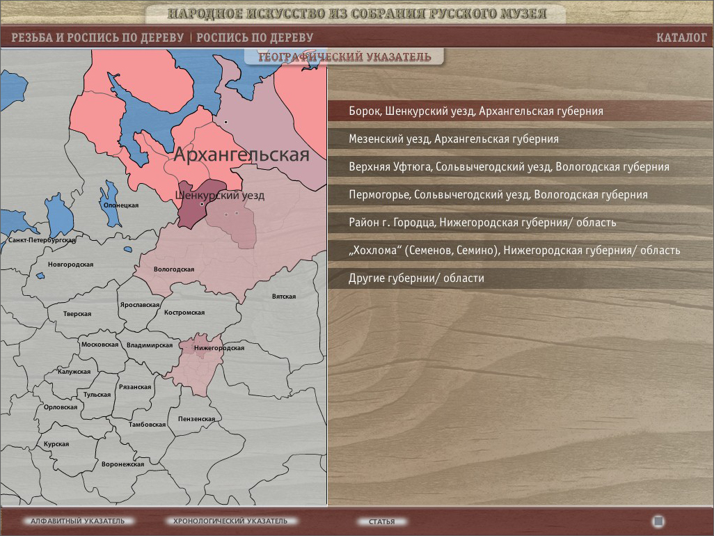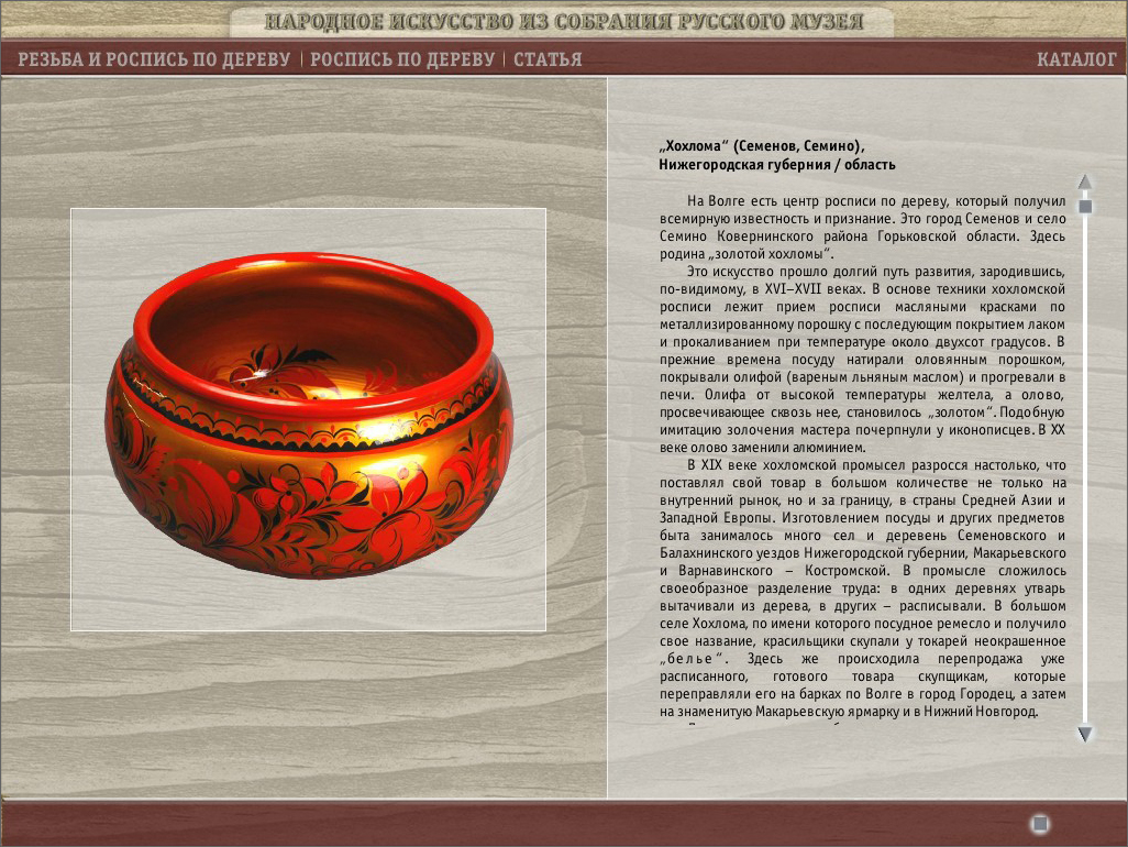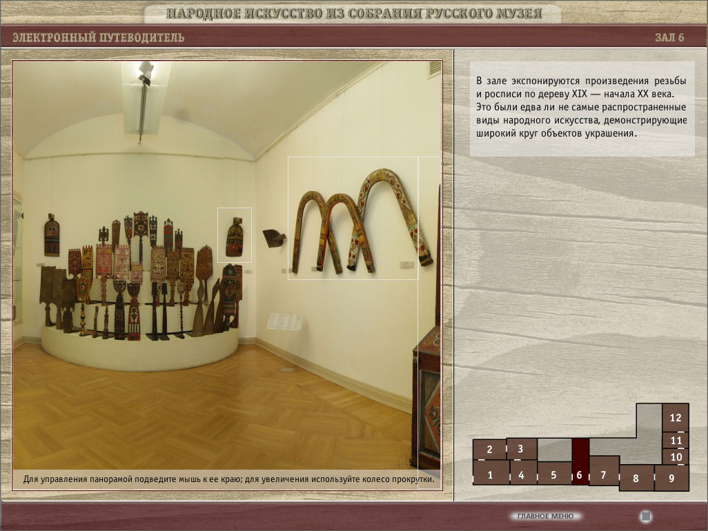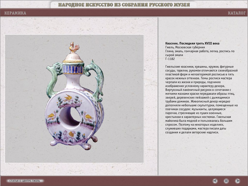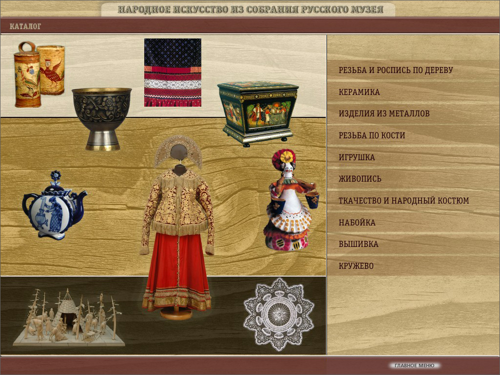 Программа подготовлена отделом народного искусства и представляет собой большой каталог произведений народного искустсва и электронный путеводитель по выставочным залам народного искусства в Русском музее.