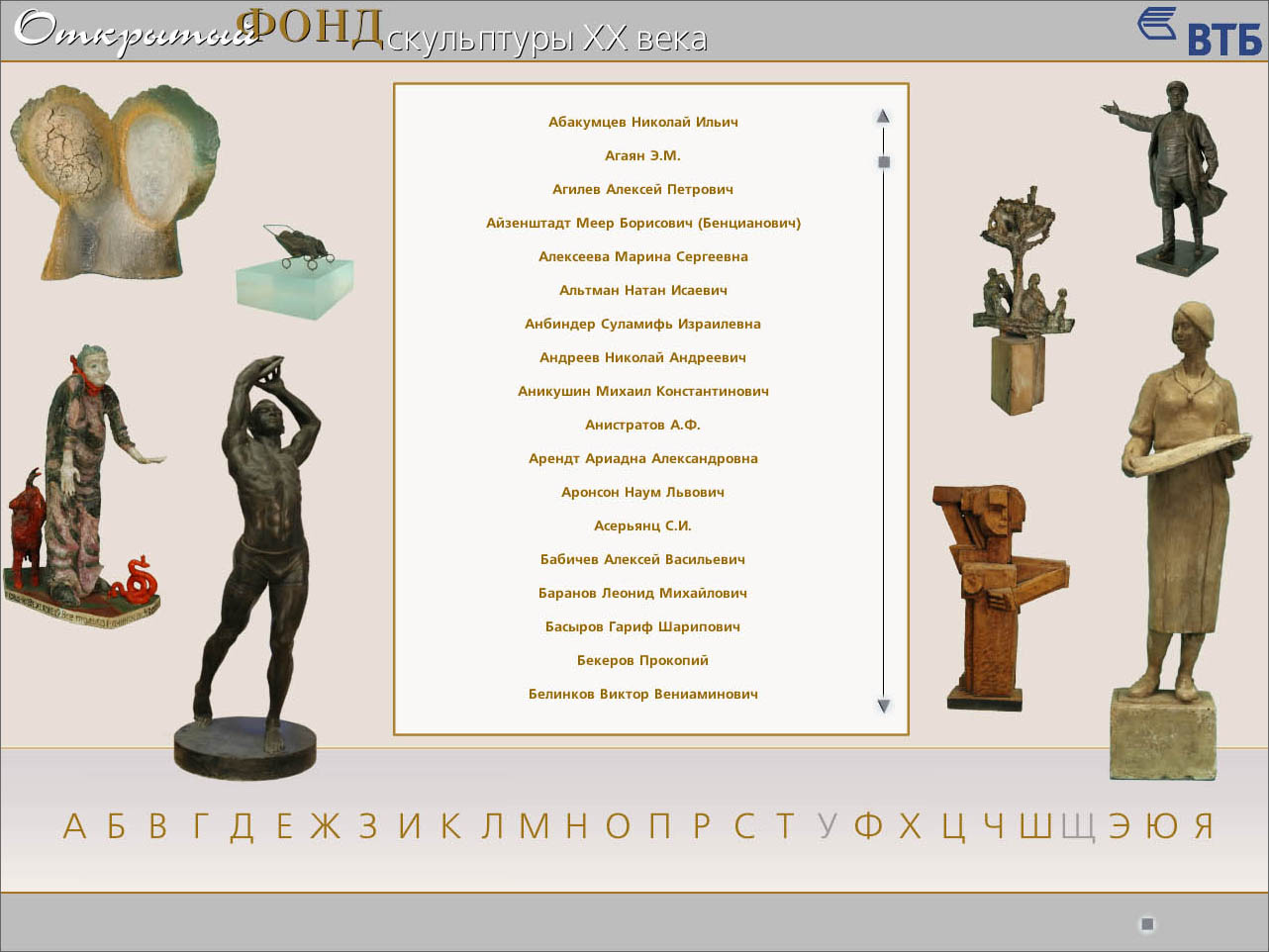 Программа демонстрирует новые возможности экспонирования скульптуры в специальном открытом хранилище – уникальный на сегодняшний день проект Русского музея, где зрители, пользуясь программой, самостоятельно выбирают экспонаты хранилища – скульптуру XX в.