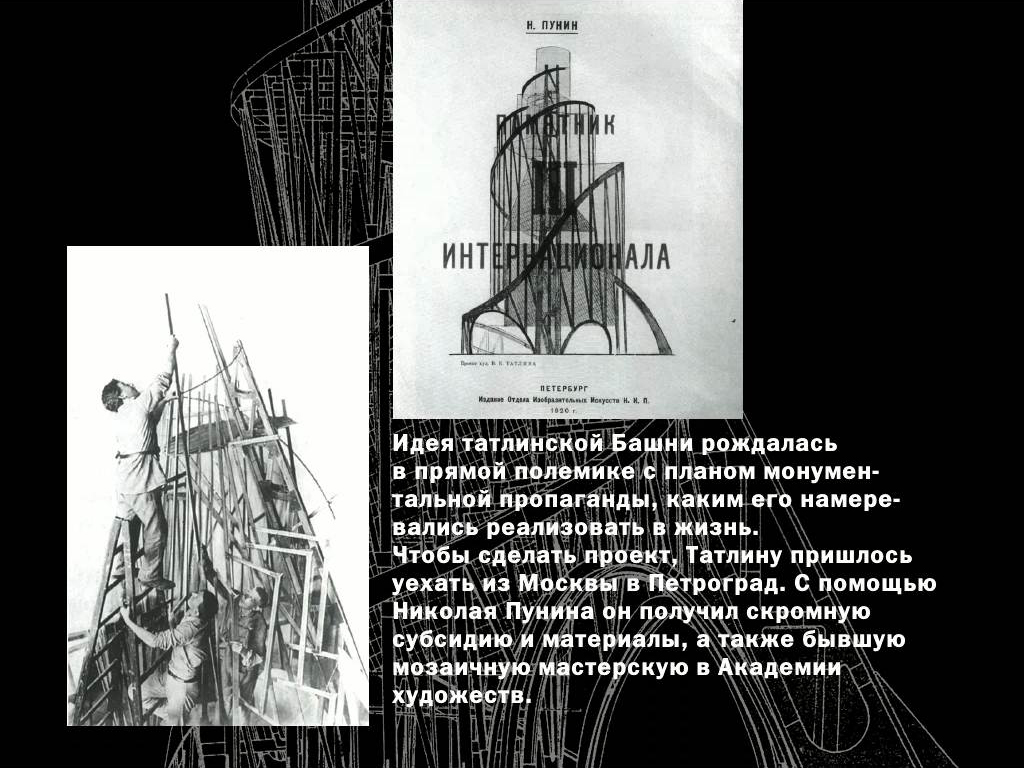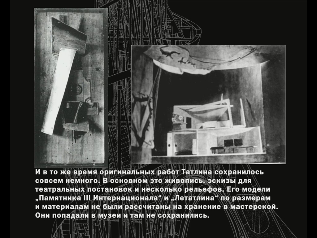 Фильм посвящен уникальному эксперименту русского авангарда 1920-х годов – «Памятнику III Интернационала» и конструкции «Летатлин» В.Е.Татлина. Воспроизводятся реконструкции этих работ художника.