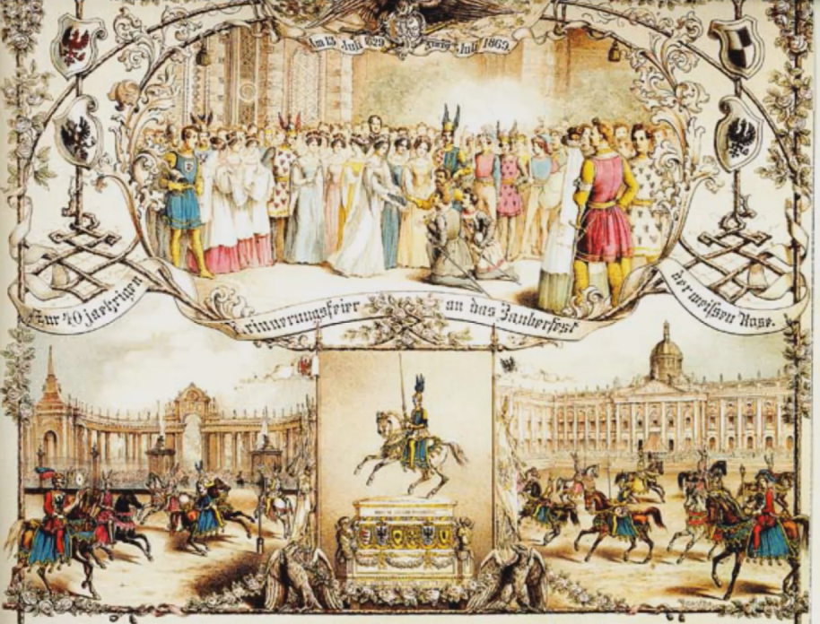 Название «Белая роза» костюмированный рыцарский турнир получил по любимому цветку императрицы Александры Федоровны. После проведения праздника появилось множество посвящённых ему произведений - сонеты, поэмы, графические альбомы с литографиями известных авторов - братьев Гропиус, Юлиуса Шоппе, Генриха Штюрмера, молодого Эдуарда Гертнера.