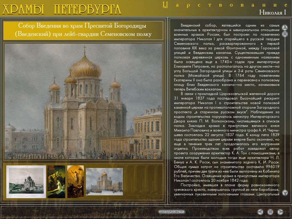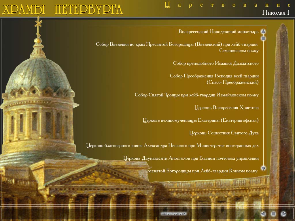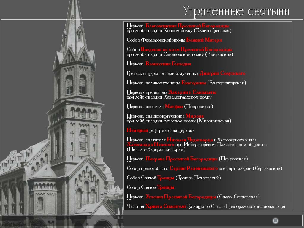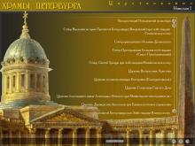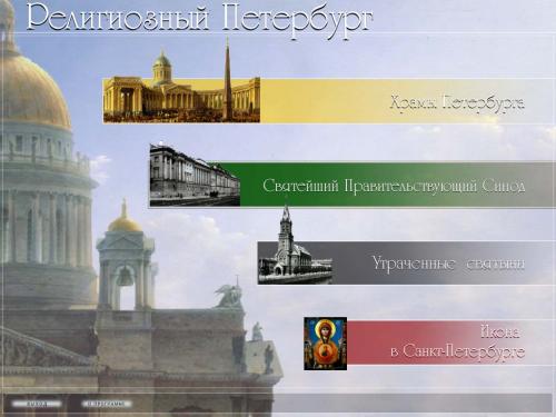 Разделы программы: Храмы Петербурга (сведения о церквях, возведенных в правление российских императоров Петра I, Екатерины I, Петра II, Анны Иоанновны, Анны Леопольдовны, Елизаветы Петровны, Петра III, Екатерины II, Павла I, Александра I, Николая I, Александра II, Александра III, Николая II), Старообрядческие церкви и моленные: Святейший Правительствующий Синод (история Синода и биографии иерархов), Утраченные святыни (фотографии храмов, разрушенных после революционных событий 1917 года), Икона в Санкт-Петербурге.