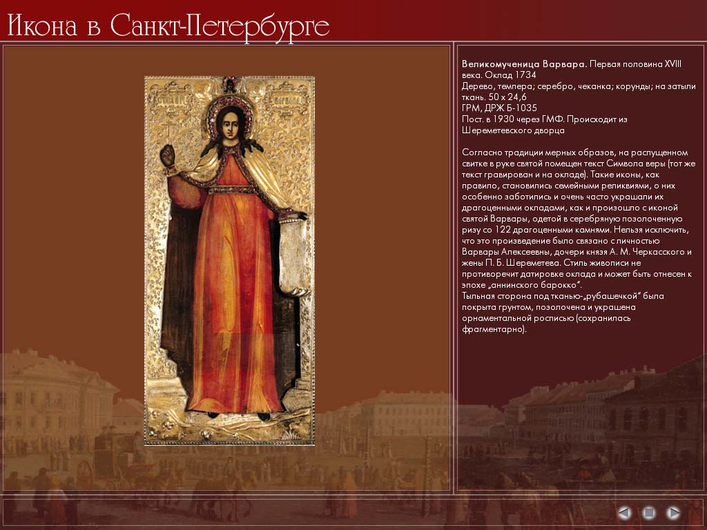 Программа рассказывает о религиозной жизни дореволюционного Петербурга и об истории Петербургских церквей. Основная часть посвящена храмам Петербурга и разделена по периодам правления от Петра I до Николая II. Фотографии храмов сопровождаются биографиями архитекторов и художников.