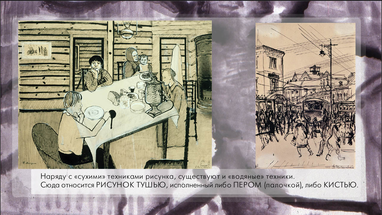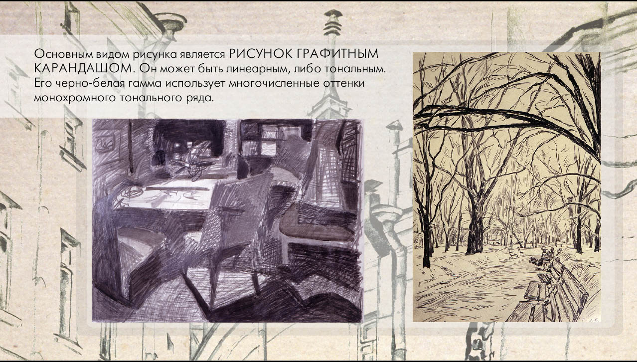 Мультимедийный фильм «Техника рисунка» создан к выставке «Рисунок и акварель в России. XX век». В фильме рассказывается о различных видах рисунка — рисунке графитным карандашом, углем, цветными карандашами, сепией, сангиной. Помимо «сухих» техник программа рассказывает и о «водяных» — рисунке тушью, ламповой копотью и черной акварелью, а также об акварели — технике, наиболее близкой к живописи.