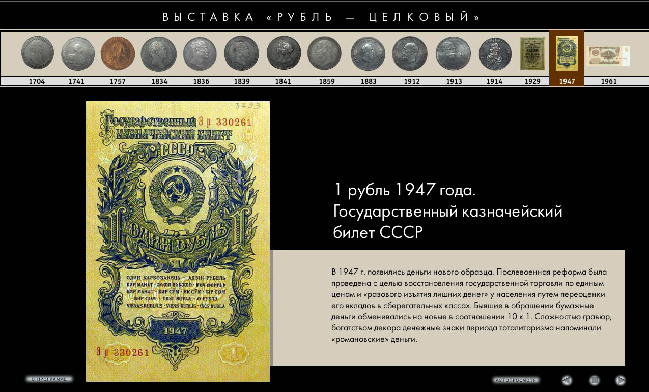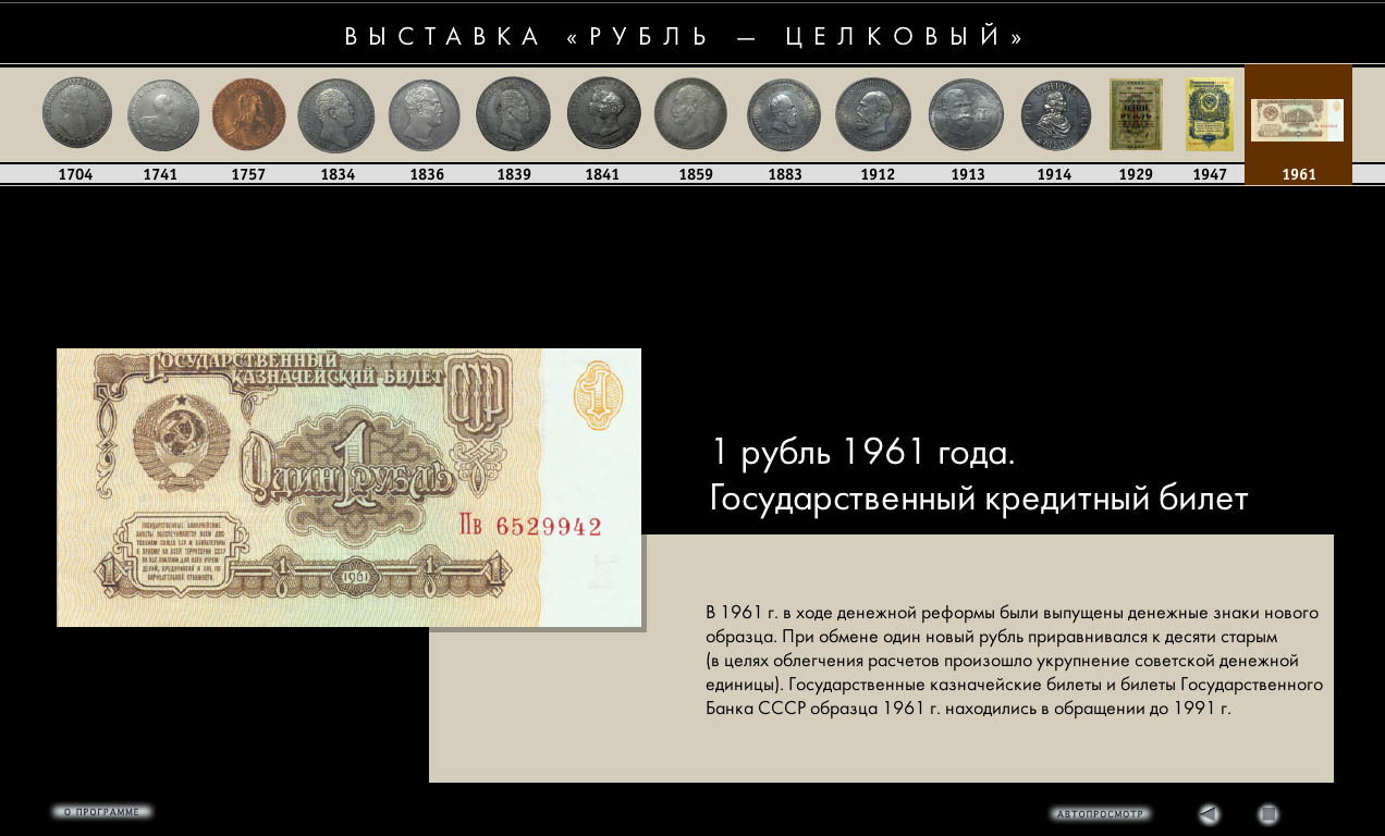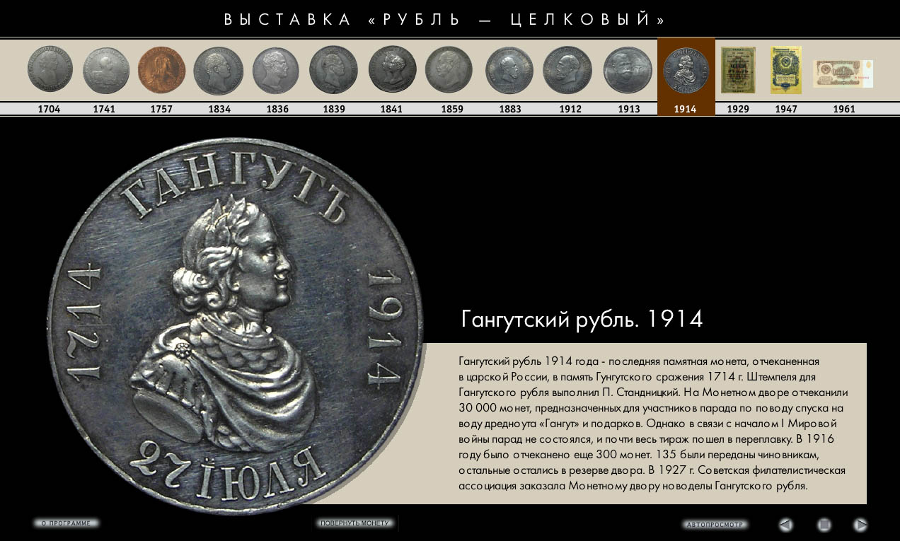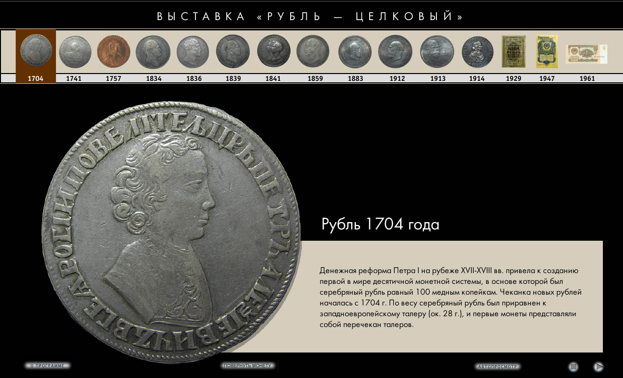 Интерактивная программа разработана к одноименной выставке, посвящена истории основной денежной единице России. Электронный каталог включает монеты и казначейские билеты, находившиеся в обращении в период с 1704 по 1991 годы (всего около 30 изображений), краткие исторические справки. Данная программа позволяет увеличить рассмотреть в деталях лицевую и оборотную стороны монеты (аверс и реверс) в интерактивном и автоматическом режиме.