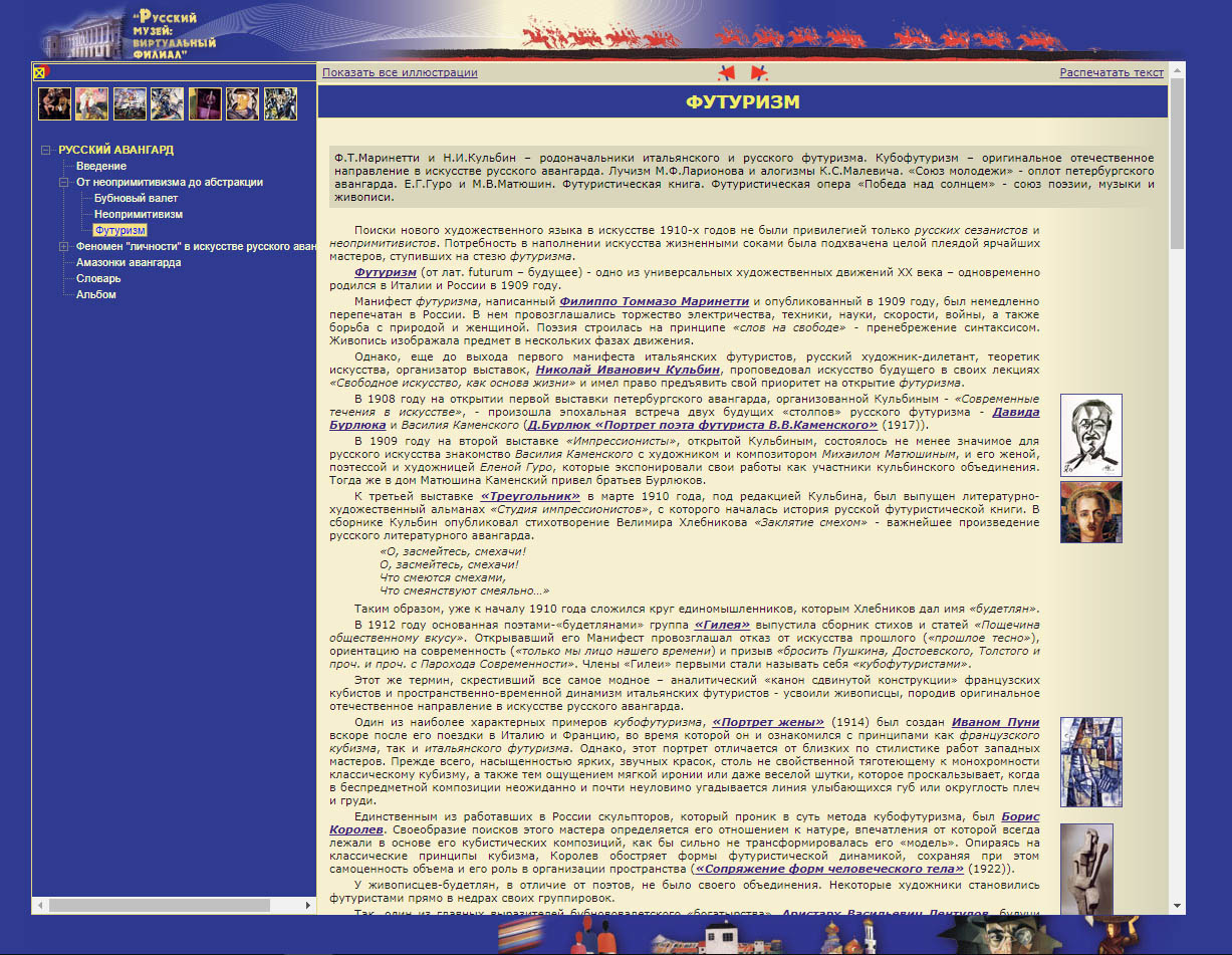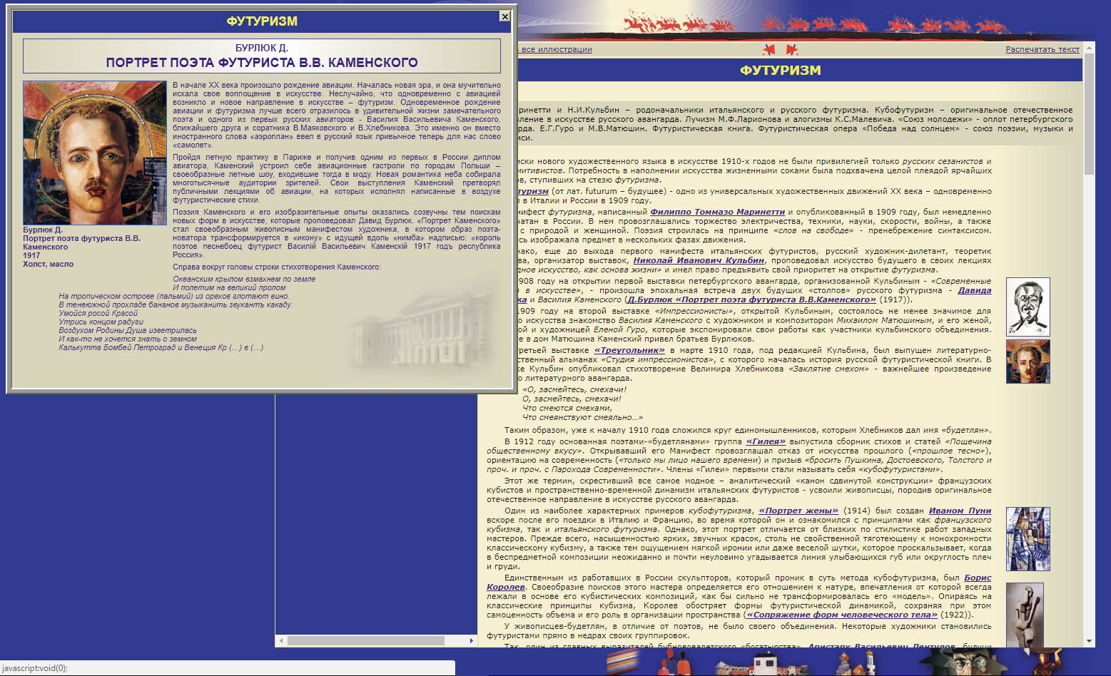Программа рассказывает о путях развития русского авангарда от неопримитивизма к абстракции. Создана специально в помощь лекторам и студентам, всем желающим самостоятельно и глубоко изучать русское искусство.