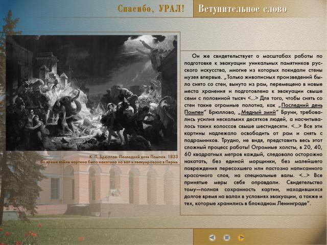 Программа показывает произведения из коллекции Русского музея, эвакуированные в годы Великой отечественной войны на Урал. Сопровождающая показ статья и документальные фотографии рассказывают о подготовке экспонатов к перевозке, работе музейных сотрудников в тылу.