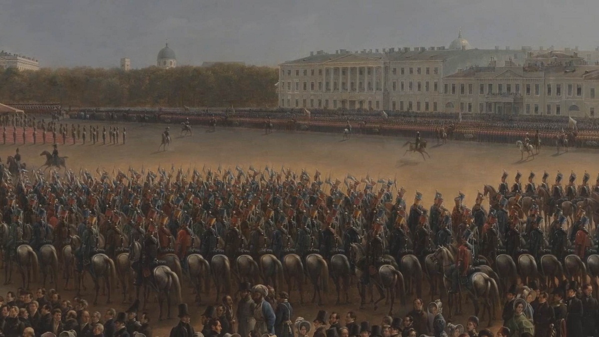 Эта картина – уникальный групповой портрет первой половины XIX века. На ней, помимо представителей разного рода войск, императора Николая I и его свиты, изображено более 200 персонажей – современников А.С.Пушкина, в том числе знаменитые художники и архитекторы, литераторы, актеры, представители научного сообщества, купцы и даже крестьяне.