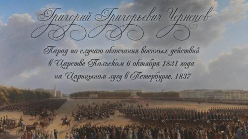 Мультимедийный фильм посвящен самой известной картине Григория Чернецова «Парад по случаю окончания военных действий в Царстве Польском 6 октября 1831 года на Царицыном лугу в Петербурге» (1837).