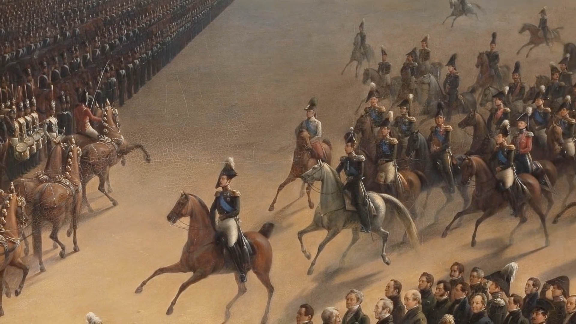 Эта картина – уникальный групповой портрет первой половины XIX века. На ней, помимо представителей разного рода войск, императора Николая I и его свиты, изображено более 200 персонажей – современников А.С.Пушкина, в том числе знаменитые художники и архитекторы, литераторы, актеры, представители научного сообщества, купцы и даже крестьяне.