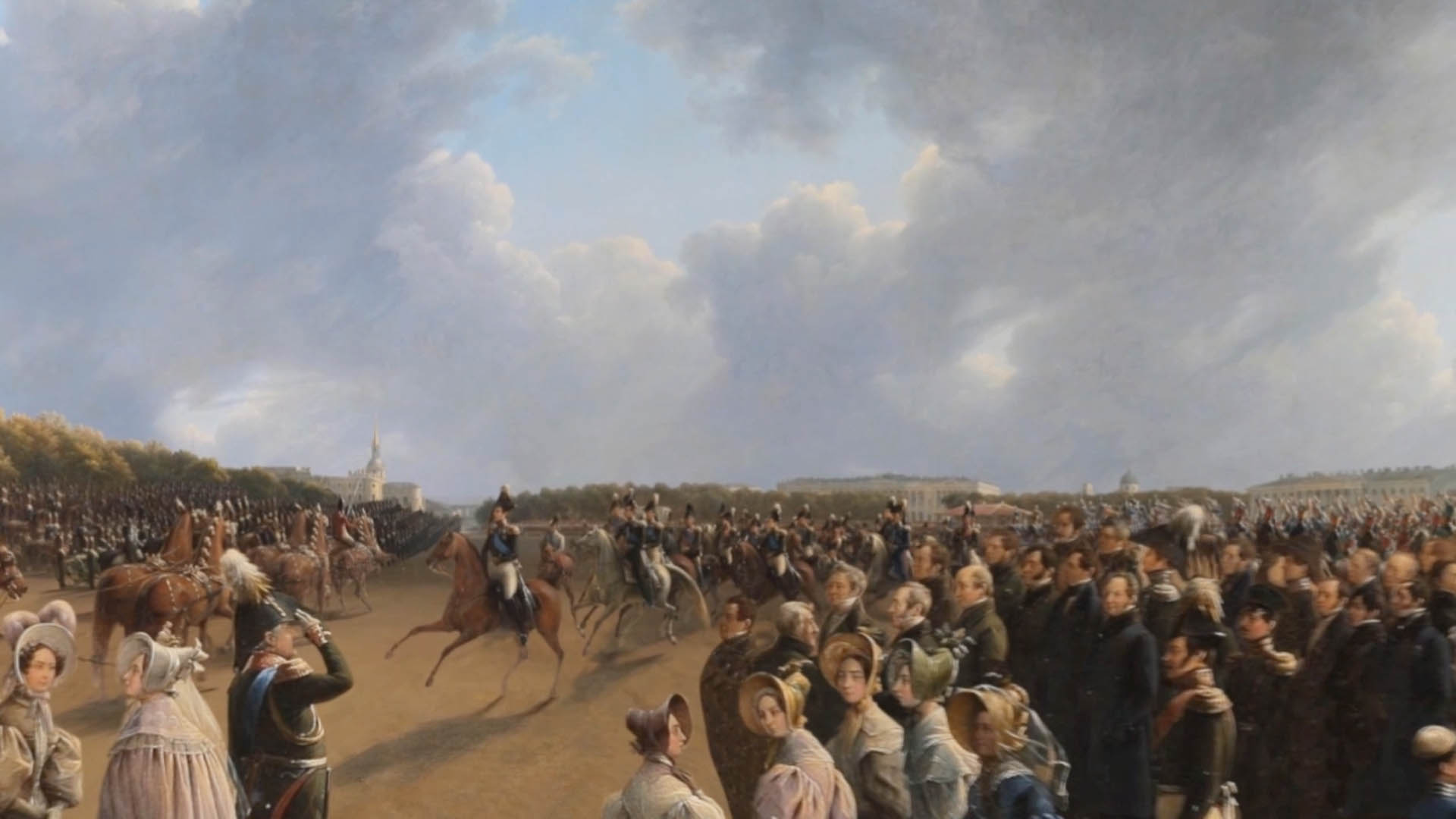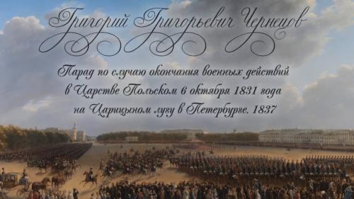 Мультимедийный фильм посвящен самой известной картине Григория Чернецова «Парад по случаю окончания военных действий в Царстве Польском 6 октября 1831 года на Царицыном лугу в Петербурге» (1837).
