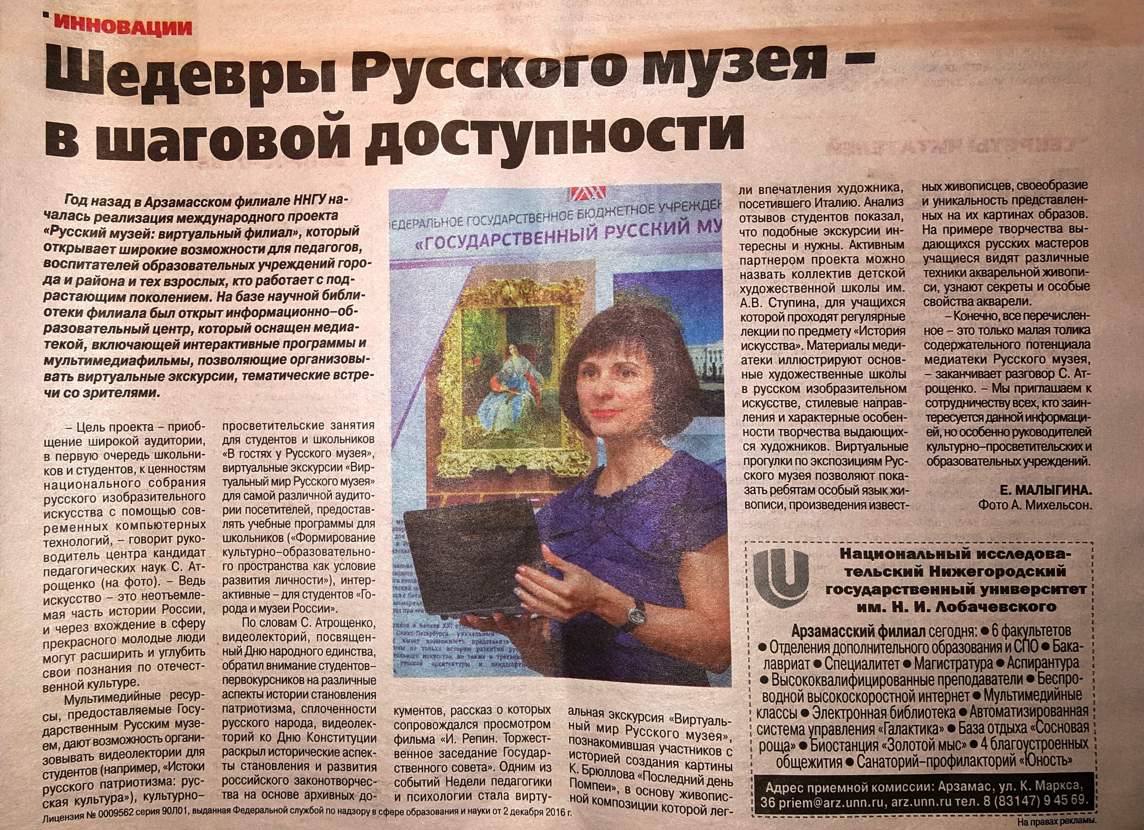 Год назад в Арзамасском филиале ННГУ началась реализация международного проекта «Русский музей: виртуальный филиал», который открывает широкие возможности для педагогов, воспитателей образовательных учреждений города и района и тех взрослых, кто работает с подрастающим поколением. На базе научной библиотеки филиала был открыт информационно-образовательный центр, который оснащен медиатекой, включающей интерактивные программы и мультимедиа-фильмы, позволяющие организовывать виртуальные экскурсии, тематические встречи со зрителями.