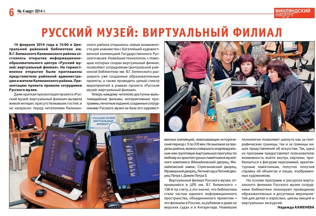 14 февраля 2014 года в 15:00 в Центральной районной библиотеке имени В.Г. Белинского Калининского района состоялось открытие информационно-образовательного центра «Русский музей: виртуальный филиал».На торжественное открытие были приглашены представители районной Администрации и жители Калининского района. Презентацию проекта провели сотрудники Русского музея.