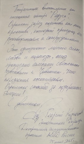 «Потрясающее впечатление от посещения центра «Радуга». Огромный заряд позитива от того креатива, который присущ его руководителям и сотрудникам. Это однозначно место силы, любви и надежды, оно пронизано самыми светлыми чувствами к Чувашии, что передается посетителям. Огромное спасибо за подаренные эмоции!»