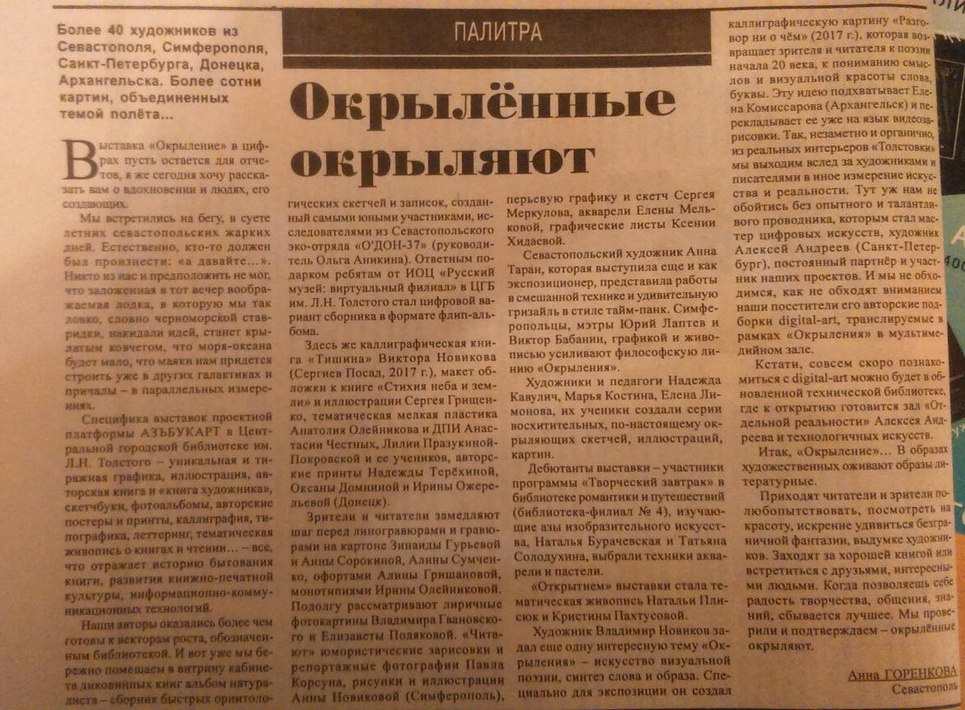 Художник Владимир Новиков задал еще одну интересную тему «Окрыления» – искусство визуальной поэзии, синтез слова и образа. Специально для экспозиции он создал каллиграфическую картину «Разговор ни о чём» (2017 г.), который возвращает зрителя и читателя к поэзии начала 20 века, к пониманию смыслов и визуальной красоты слова, буквы. Эту идею подхватывает Елена Комиссарова (Архангельск) и перекладывает ее уже на язык видео-зарисовки. Так, незаметно и органично из реальных интерьеров Толстовки мы выходим в след за художниками и писателями в иное измерение искусства и реальности. Тут уж нам не обойтись без опытного и талантливого проводника, которым стал мастер цифровых искусств, художник Алексей Андреев (Санкт - Петербург), постоянный партнёр и участник наших проектов. И мы не обходимся, как не обходят вниманием наши посетители его авторские подборки digital-art, транслируемые в рамках «Окрыления» в мультимедийном зале.