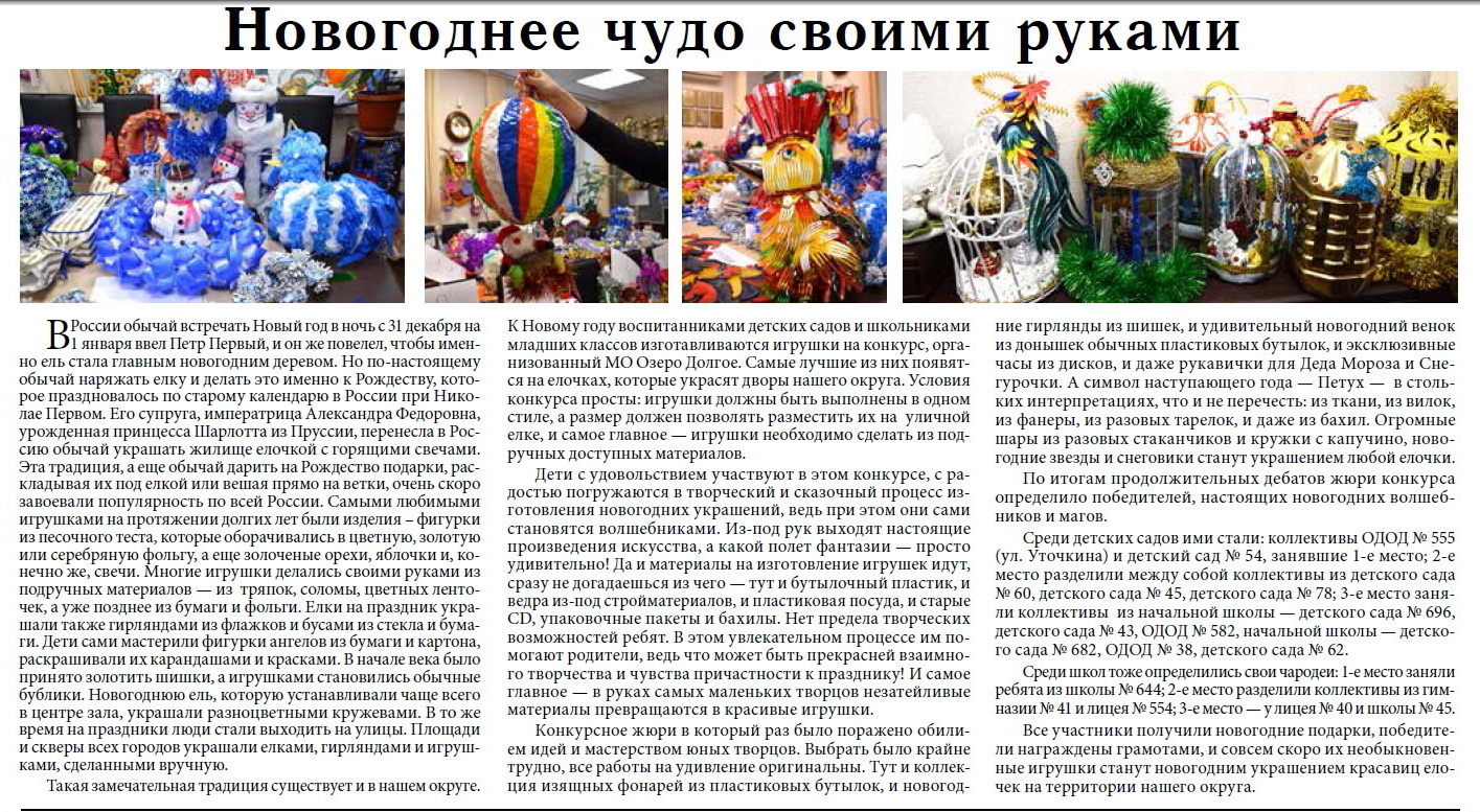 К Новому году воспитанниками детских садов и школьникамимладших классов изготавливаются игрушки на конкурс, орга-низованный МО Озеро Долгое. Самые лучшие из них появят-ся на елочках, которые украсят дворы нашего округа. Условияконкурса просты: игрушки должны быть выполнены в одномстиле, а размер должен позволять разместить их на уличнойелке, и самое главное — игрушки необходимо сделать из под-ручных доступных материалов.Дети с удовольствием участвуют в этом конкурсе, с ра-достью погружаются в творческий и сказочный процесс из-готовления новогодних украшений, ведь при этом они самистановятся волшебниками. Из-под рук выходят настоящиепроизведения искусства, а какой полет фантазии — простоудивительно! Да и материалы на изготовление игрушек идут,сразу не догадаешься из чего — тут и бутылочный пластик, иведра из-под стройматериалов, и пластиковая посуда, и старыеCD, упаковочные пакеты и бахилы. Нет предела творческихвозможностей ребят. В этом увлекательном процессе им по-могают родители, ведь что может быть прекрасней взаимно-го творчества и чувства причастности к празднику! И самоеглавное — в руках самых маленьких творцов незатейливыематериалы превращаются в красивые игрушки.Конкурсное жюри в который раз было поражено обили-ем идей и мастерством юных творцов. Выбрать было крайнетрудно, все работы на удивление оригинальны. Тут и коллек-ция изящных фонарей из пластиковых бутылок, и новогодние гирлянды из шишек, и удивительный новогодний венокиз донышек обычных пластиковых бутылок, и эксклюзивныечасы из дисков, и даже рукавички для Деда Мороза и Сне-гурочки. А символ наступающего года — Петух — в столь-ких интерпретациях, что и не перечесть: из ткани, из вилок,из фанеры, из разовых тарелок, и даже из бахил. Огромныешары из разовых стаканчиков и кружки с капучино, ново-годние звезды и снеговики станут украшением любой елочки.По итогам продолжительных дебатов жюри конкурсаопределило победителей, настоящих новогодних волшеб-ников и магов.Среди детских садов ими стали: коллективы ОДОД № 555(ул. Уточкина) и детский сад № 54, занявшие 1-е место; 2-еместо разделили между собой коллективы из детского сада№ 60, детского сада № 45, детского сада № 78; 3-е место заня-ли коллективы из начальной школы — детского сада № 696,детского сада № 43, ОДОД № 582, начальной школы — детско-го сада № 682, ОДОД № 38, детского сада № 62.Среди школ тоже определились свои чародеи: 1-е место занялиребята из школы № 644; 2-е место разделили коллективы из гим-назии № 41 и лицея № 554; 3-е место — у лицея № 40 и школы № 45.Все участники получили новогодние подарки, победите-ли награждены грамотами, и совсем скоро их необыкновен-ные игрушки станут новогодним украшением красавиц ело-чек на территории нашего округа.