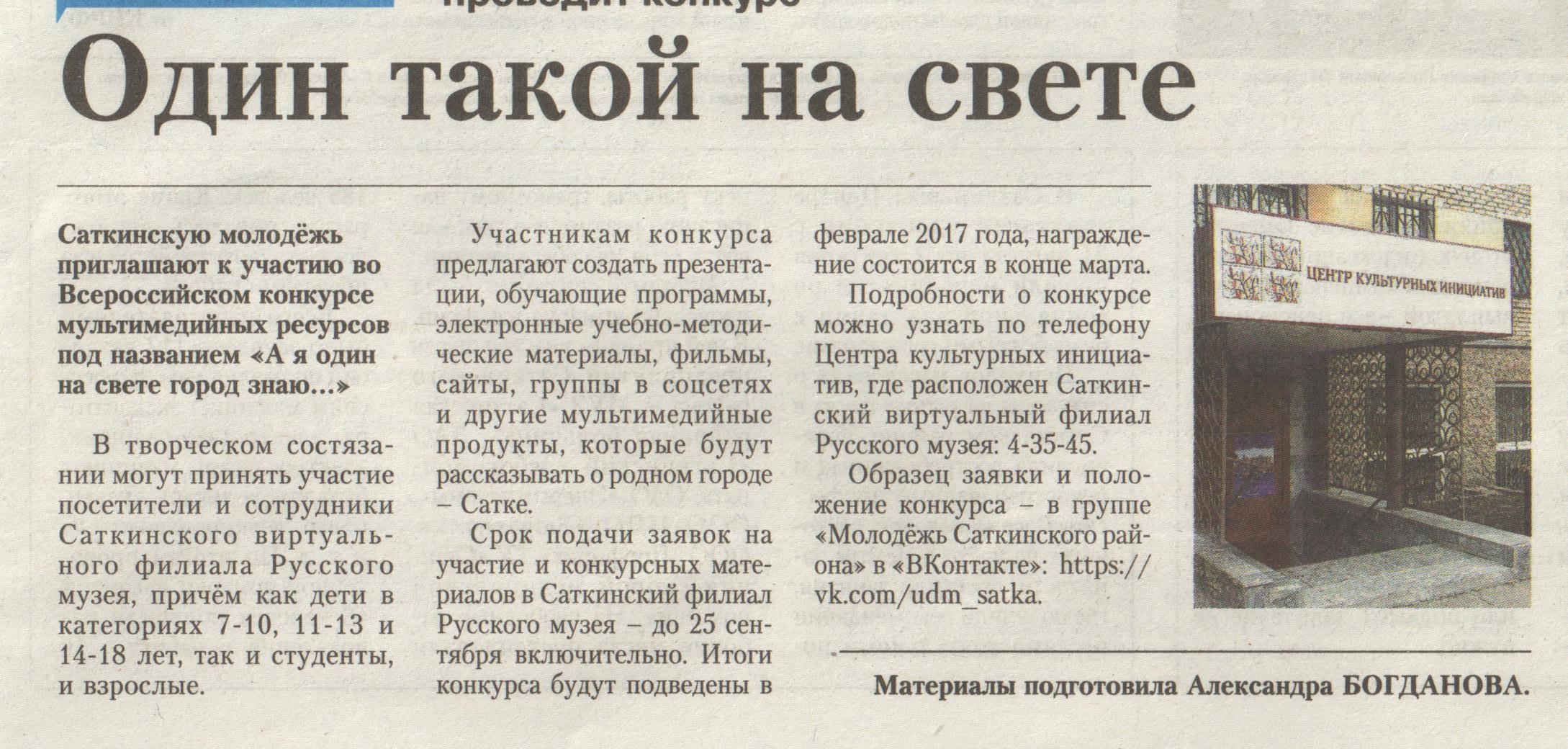 Подробности о конкурсе можно узнать по телефону Центра культурных инициатив, где расположен Саткинский виртуальный филиал Русского музея: 4 – 35 – 45.