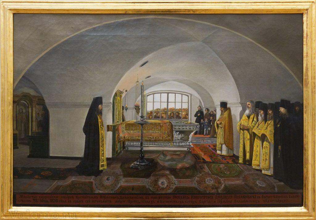 Художники запечатлели Валаам таким, каким он был более 150 лет назад. По зимним пейзажам Петра Ивановича Балашова 1864 года мы, например, узнаём, что на острове было стадо северных оленей. В середине 19 века здесь проживало около тысячи человек, работали производства, часовая, токарная и иконописная мастерские, пекарня. Художник Владимир Бондаренко запечатлел детали валаамского быта и написал 12 картин о работе в мастерских. На картине Eгора Ознобишина запечатлён визит на Валаам императора Александра II с семьей 28 июня 1858 года в День преподобных Сергия и Германа. В начале 19 века святой остров посещал Александр I, в конце XIX века здесь побывал Александр III.