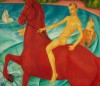 «Купание красного коня» — это картина-аллегория, живописная притча. К подобному решению художник пришел не сразу. Сохранившиеся рисунки, эскизы и фотография первого варианта (всего их, как утверждал автор, было три) полотна свидетельствуют о том, что в основе были непосредственные впечатления от сцены купания коней на Волге в Хвалынске. Петрову-Водкину позировали двоюродный брат Шура и конь Мальчик, но это едва ли возможно почувствовать в окончательном варианте картины. Постепенно художник все более удаляется от конкретности. При этом он умело вписывает отдельные бытовые детали в контекст эпического повествования. Увиденная сцена переплавляется в действо, особенности которого указывают на вневременность происходящего, напоминая одновременно икону с образом Святого Георгия и фрески Доменико Гирландайо. В застывшей динамике композиции, которую «взрывает» окрашенная яркой киноварью фигура коня, заключен выразительный диссонанс, рождающий чувство тревоги и смутных предчувствий. «Скрытый сюжет» — это выражение Петрова-Водкина — заставляет зрителя соучаствовать в создании образа. Много позже современники, да и сам художник, подчеркивали пророческий характер образа, как предвидение войны и революции. Вспомним, что в 1912–1913 годах Павел Филонов напишет своего всадника на красном коне («Россия после 1905 года»), Василий Кандинский — «Святого Георгия» (1911), и скачущий всадник станет символом целого движения. Ольга Мусакова. Мгновения вечности // Кузьма Сергеевич Петров-Водкин. СПб. 2018. С. 8.