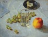 Умение видеть мир в капле воды, выразить планетарные ощущения в округлой форме хвалынского яблока, передать единство мироздания в отражениях и пересечениях предметов — эта особенность присуща натюрмортам Петрова-Водкина. Заостренность проблемы формального решения — проработан каждый сантиметр живописной поверхности, демонстрируя мастерское владение оттенками основных цветов, умение достичь минимальными средствами пластической завершенности форм — придает им исключительную выразительность. В то же время в них нет схематизма и какой-либо отрешенности от реальной жизни, поэтому в самом «тихом» жанре художник находит способ выразить отклик на современность. Ольга Мусакова. Мгновения вечности // Кузьма Сергеевич Петров-Водкин. СПб. 2018. С. 14.